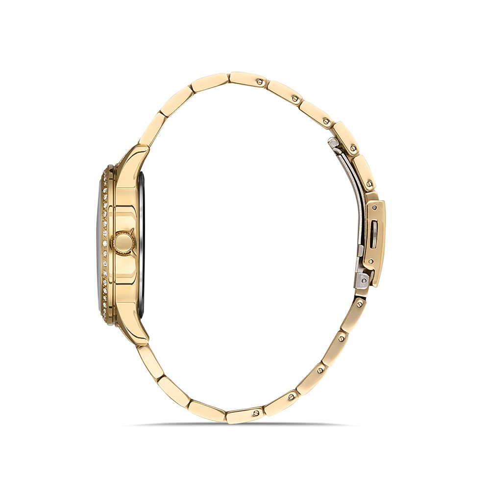 Indicatoare luminoase; cadran si carcasa decorate cu zirconii albe; bratara tip zale, cu inchizatoare tip fluture.