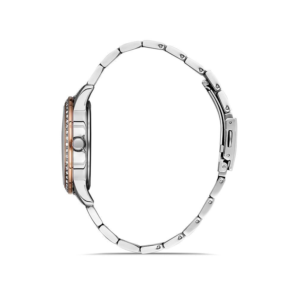 Indicatoare luminoase; cadran decorat cu zirconii albe; carcasa cu bezel decorativ auriu rose si zirconii albe; bratara tip zale, in doua culori, argintiu si auriu rose, cu inchizatoare tip fluture.
