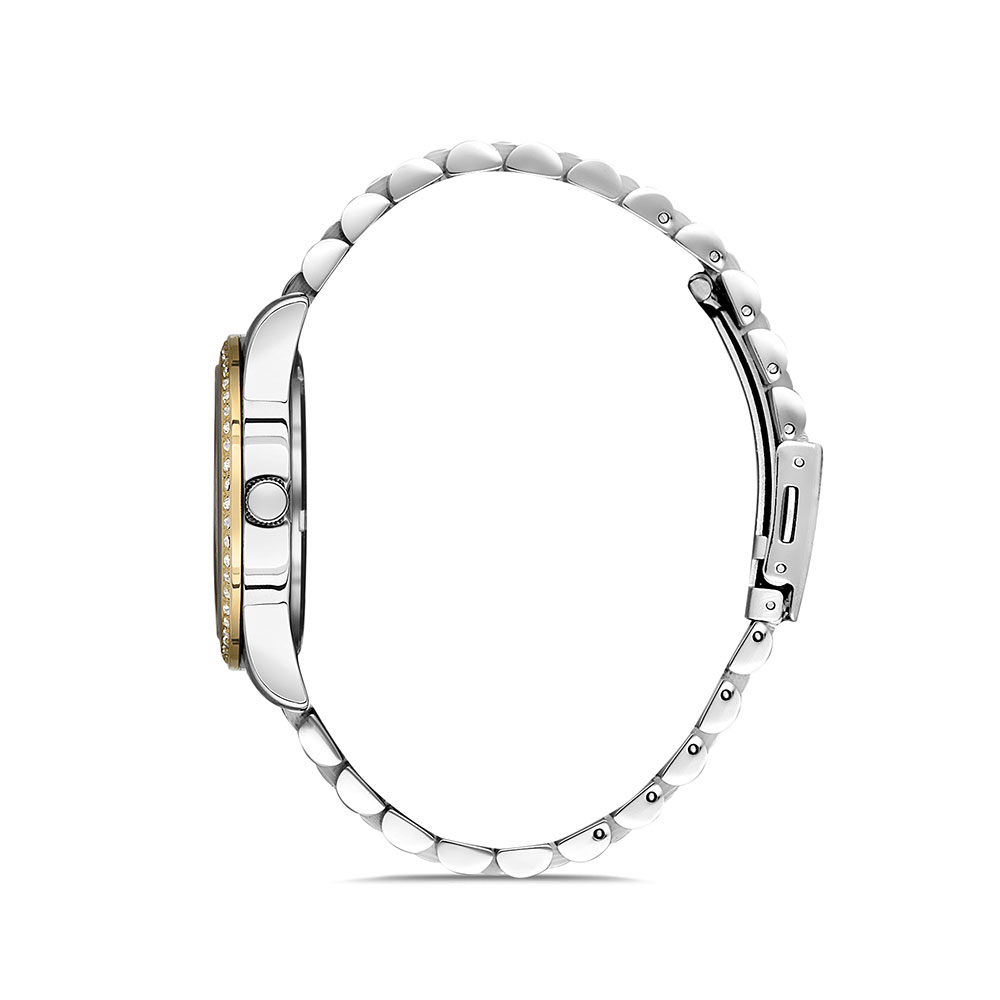 Carcasa cu bezel decorativ auriu si zirconii albe; bratara tip zale, in doua culori, argintiu si auriu, cu inchizatoare tip fluture.