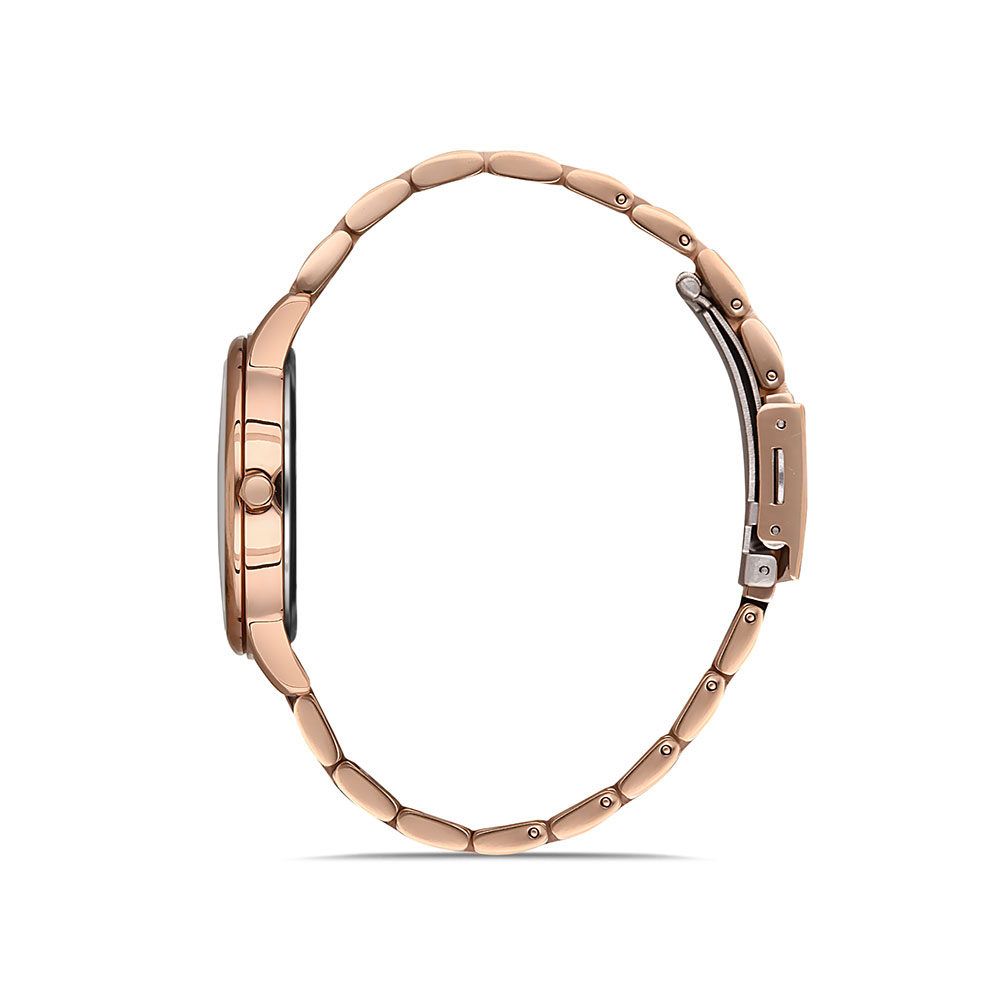 Cadran decorat cu zirconii; bratara tip zale, cu inchizatoare tip fluture; fara indicator secunde.