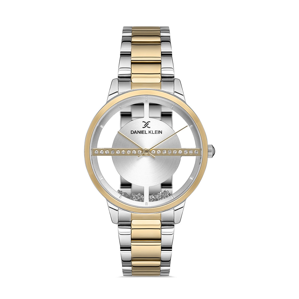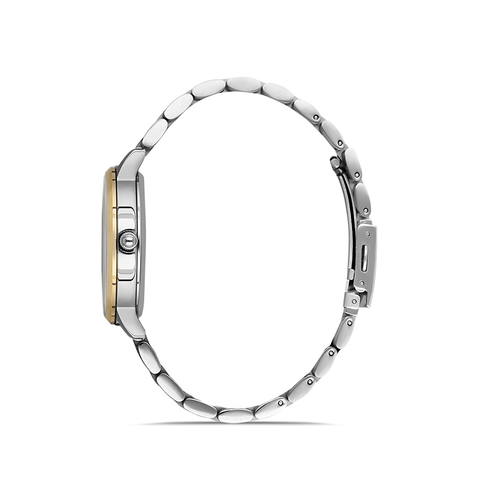 Cadran si capac partial transparente; carcasa argintie, cu bezel decorativ auriu; bratara tip zale, in doua culori, argintiu si auriu, cu inchizatoare tip fluture; fara indicator secunde.