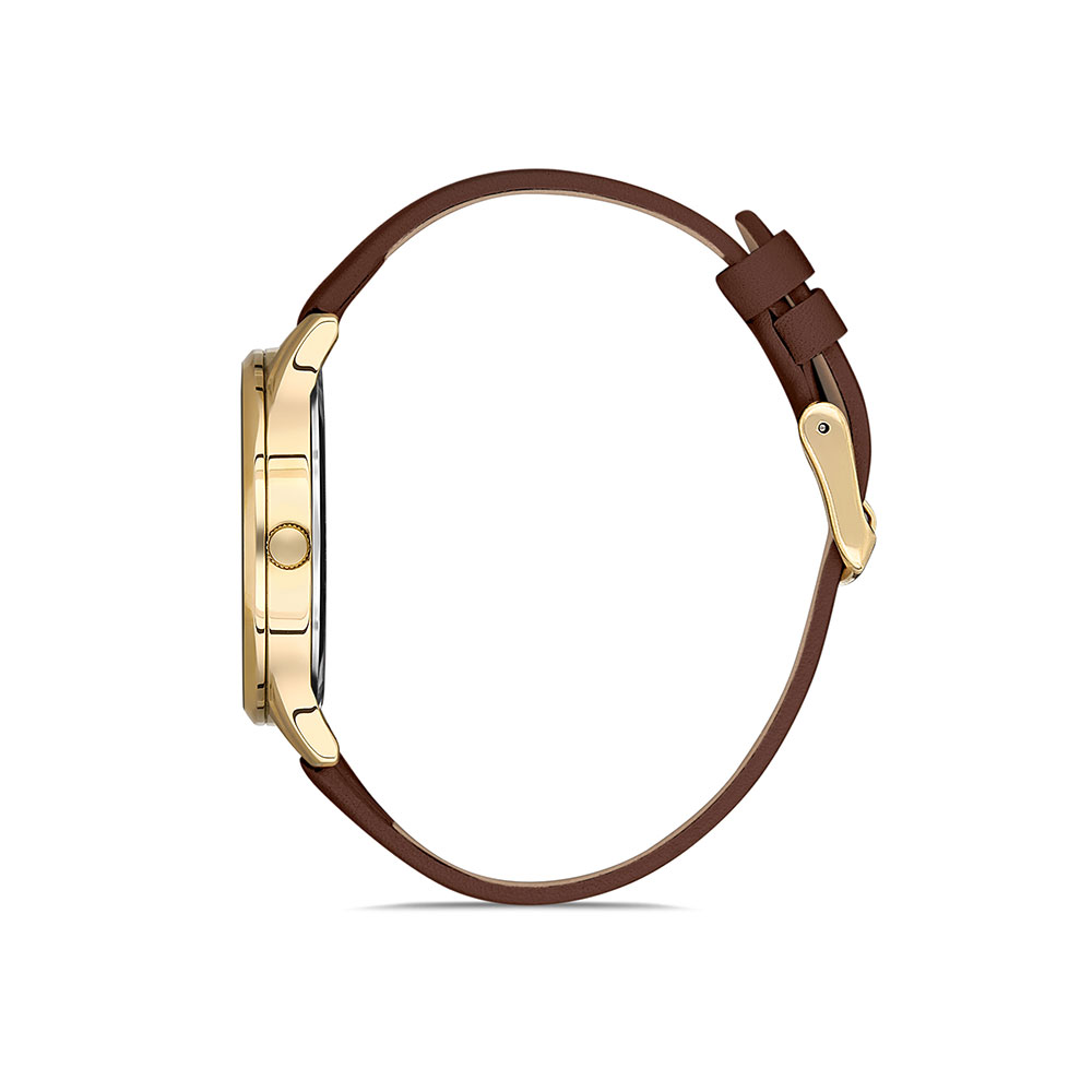 Cadran decorat cu zirconii albe; fara indicator secunde.