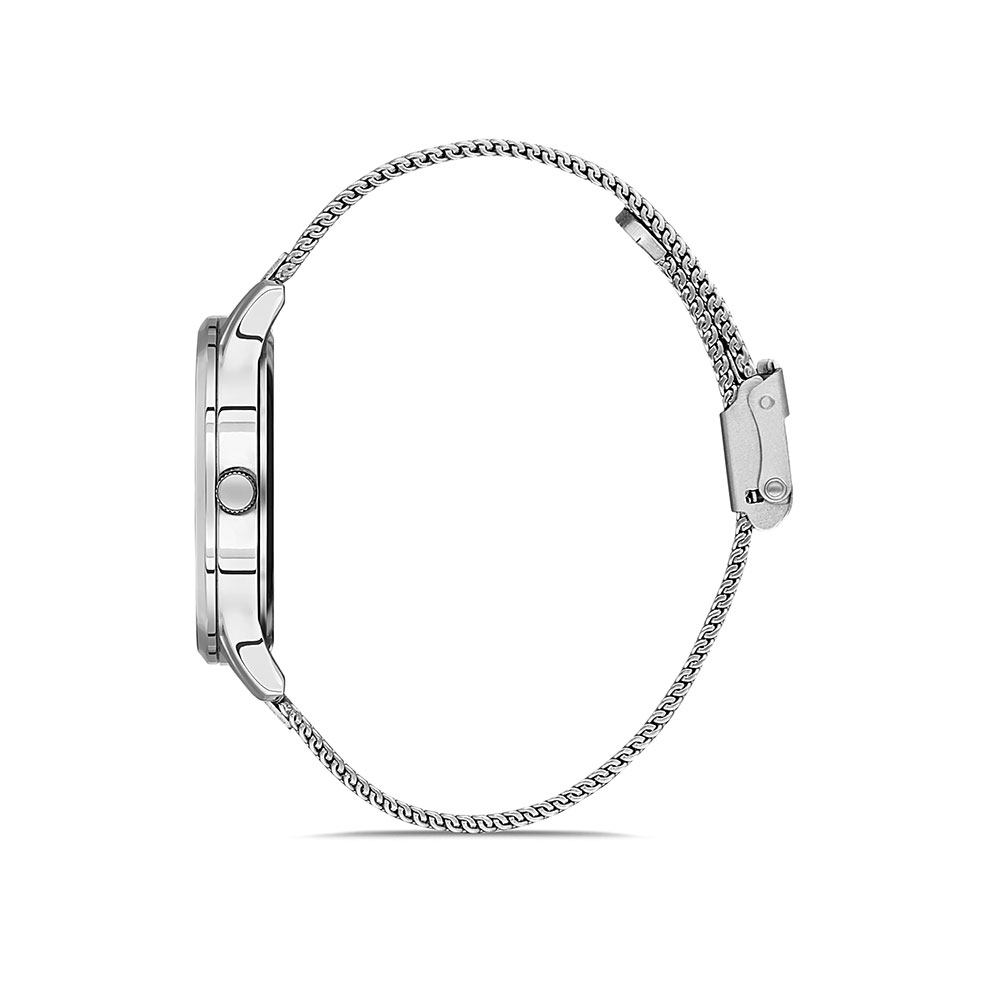 Cadran decorat cu zirconii albe; bratara tip mesh, cu inchizatoare reglabila; fara indicator secunde.