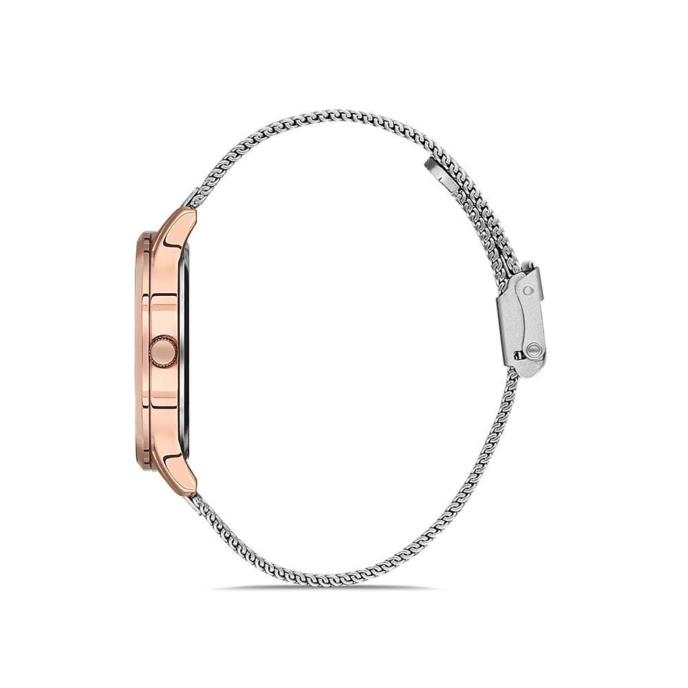 Cadran decorat cu zirconii albe; bratara tip mesh, cu inchizatoare reglabila; fara indicator secunde.