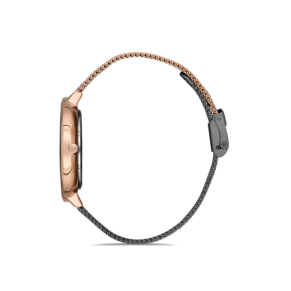 Bratara tip mesh, formata dintr-o parte de culoare aurie rose si una antracit, cu inchizatoare reglabila; fara indicator secunde.