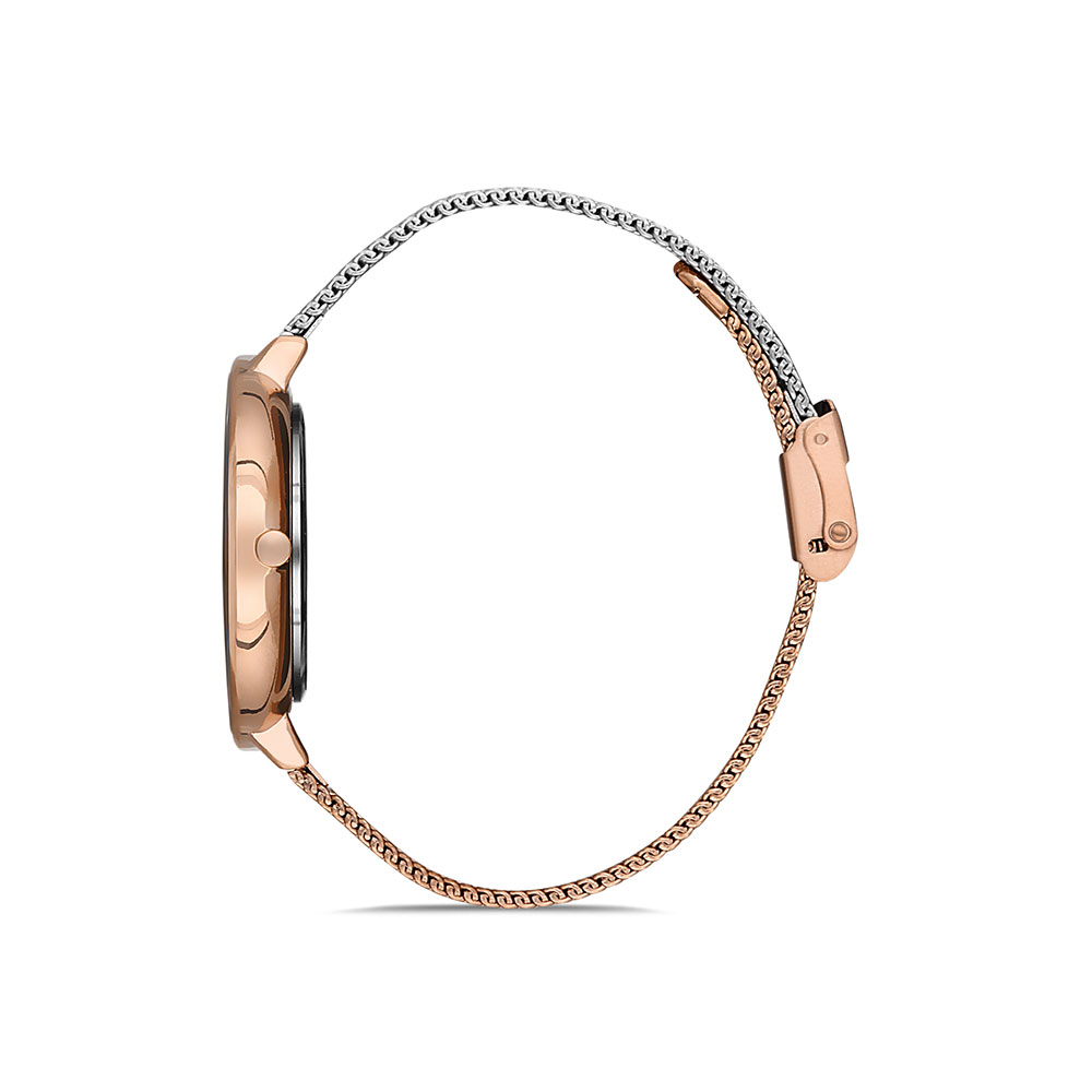 Bratara tip mesh, formata dintr-o parte de culoare argintie si una aurie rose, cu inchizatoare reglabila; fara indicator secunde.