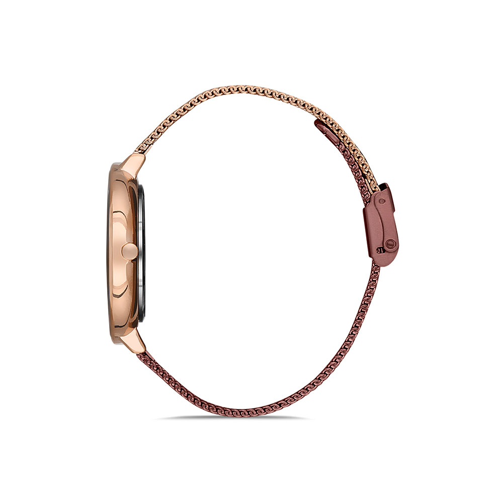 Bratara tip mesh, formata dintr-o parte de culoare aurie rose si una burgund, cu inchizatoare reglabila; fara indicator secunde.