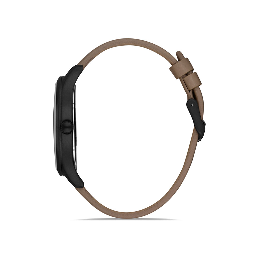 Carcasa rotunda de 44 mm, realizata din aliaj metalic negru, confera un aspect robust si elegant, in timp ce cureaua din piele bej cu detalii decorative discrete adauga un plus de stil si confort.