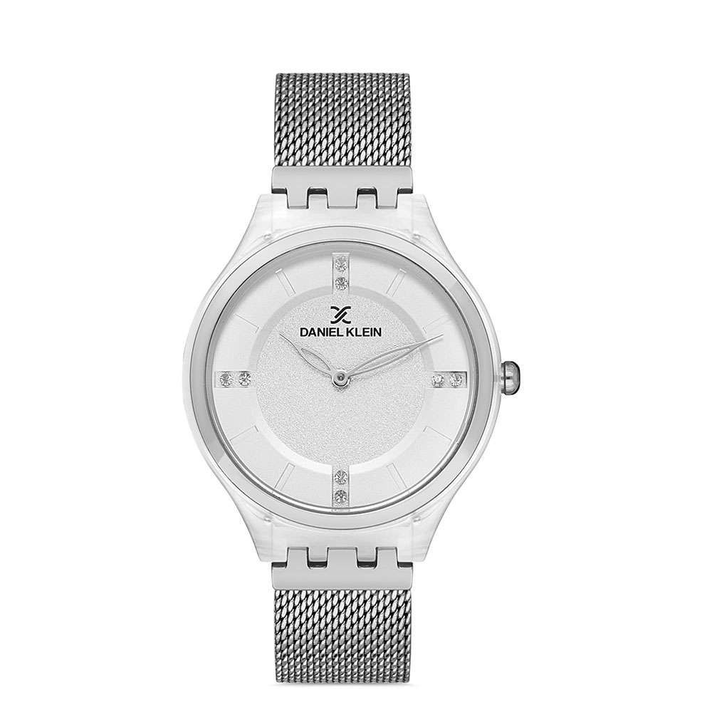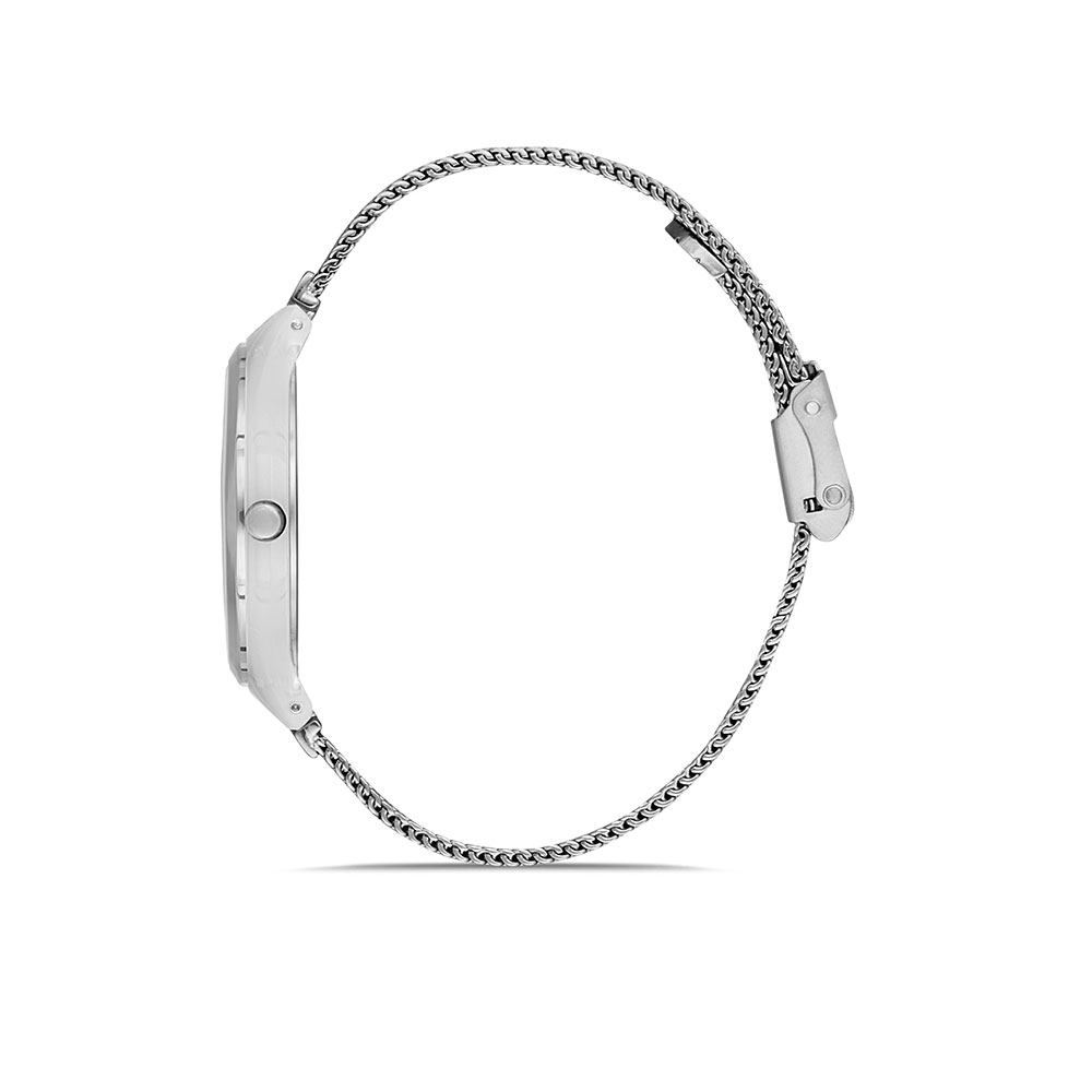 Cadran decorat cu zirconii albe; carcasa alba, cu bezel decorativ argintiu; bratara tip mesh, cu inchizatoare reglabila; fara indicator secunde.