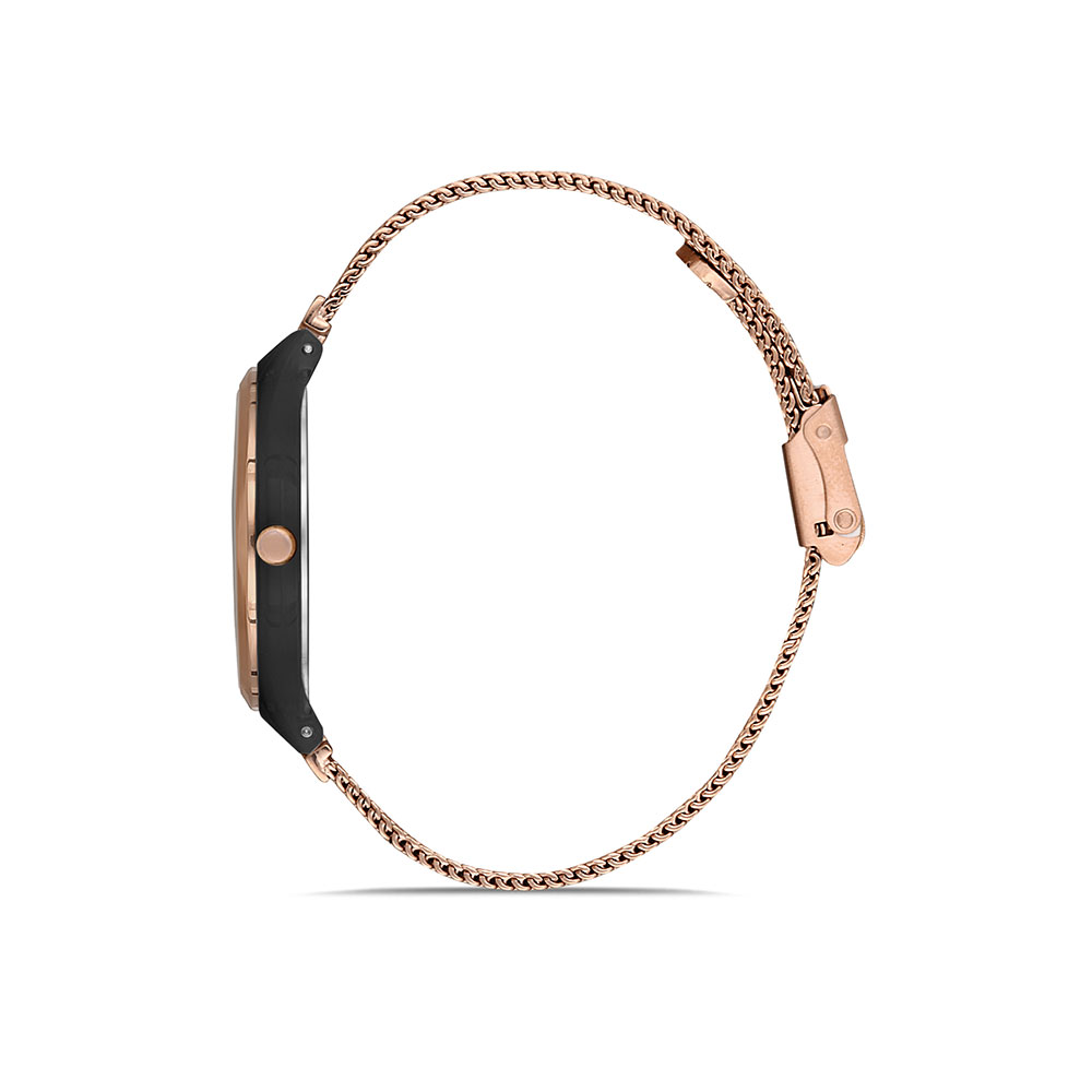 Cadranul rotund, de 36 mm, are un fundal negru profund, decorat cu cristale stralucitoare dispuse strategic pentru un plus de rafinament. Conturul in nuante de auriu rose creeaza un contrast elegant, accentuand aspectul luxos al ceasului.