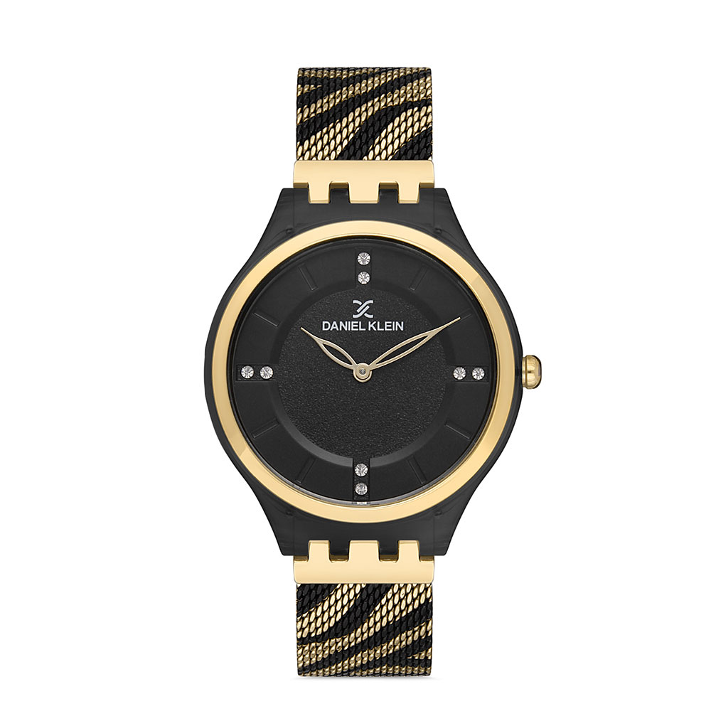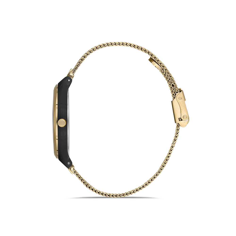 Cadran decorat cu zirconii albe; carcasa neagra, cu bezel decorativ auriu; bratara tip mesh, cu inchizatoare reglabila; fara indicator secunde.