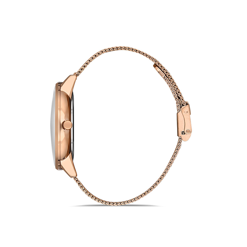 Acest ceas impresioneaza prin combinatia armonioasa dintre cadranul argintiu cu textura subtila si carcasa aurie rose, oferindu-i un aspect rafinat si usor de asortat. Bratara tip mesh, realizata din aliaj metalic auriu rose, completeaza perfect designul elegant, oferind confort si durabilitate.