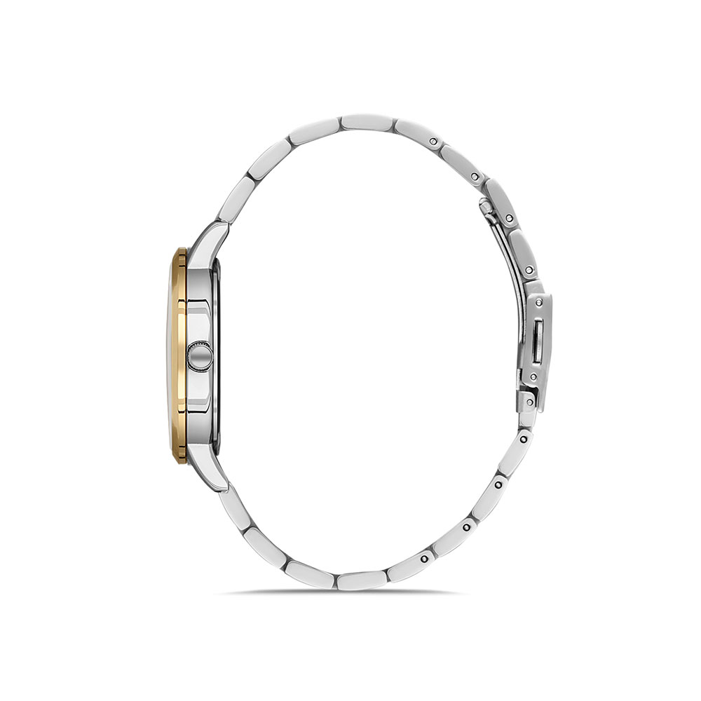 Carcasa argintie, cu bezel decorativ auriu, bratara tip zale, in doua culori, argintiu si auriu, cu inchizatoare tip fluture.