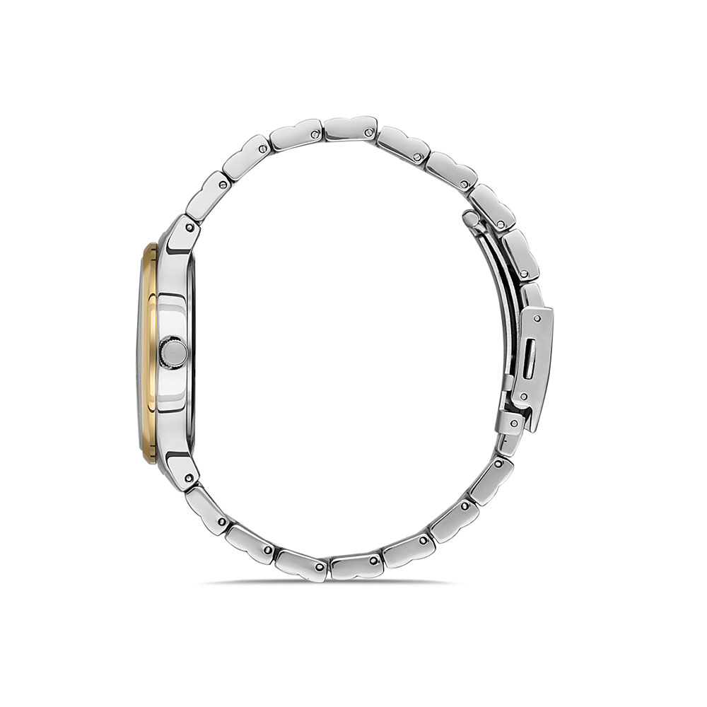Cadranul argintiu cu finisaj subtil perlat este accentuat de marcaje aurii si cristale stralucitoare, adaugand un plus de eleganta fiecarui moment. Carcasa rotunda, cu diametrul de 34 mm si grosimea de 9 mm, este realizata din aliaj metalic rezistent, fiind completata de o bratara bicolora din otel inoxidabil in nuante de argintiu si auriu, care asigura un confort optim la purtare.