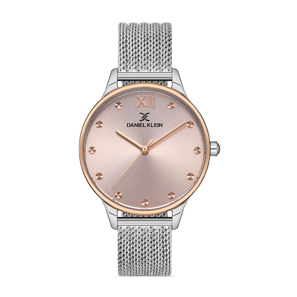 Carcasa argintie, cu bezel decorativ auriu rose; bratara tip mesh, cu inchizatoare reglabila.