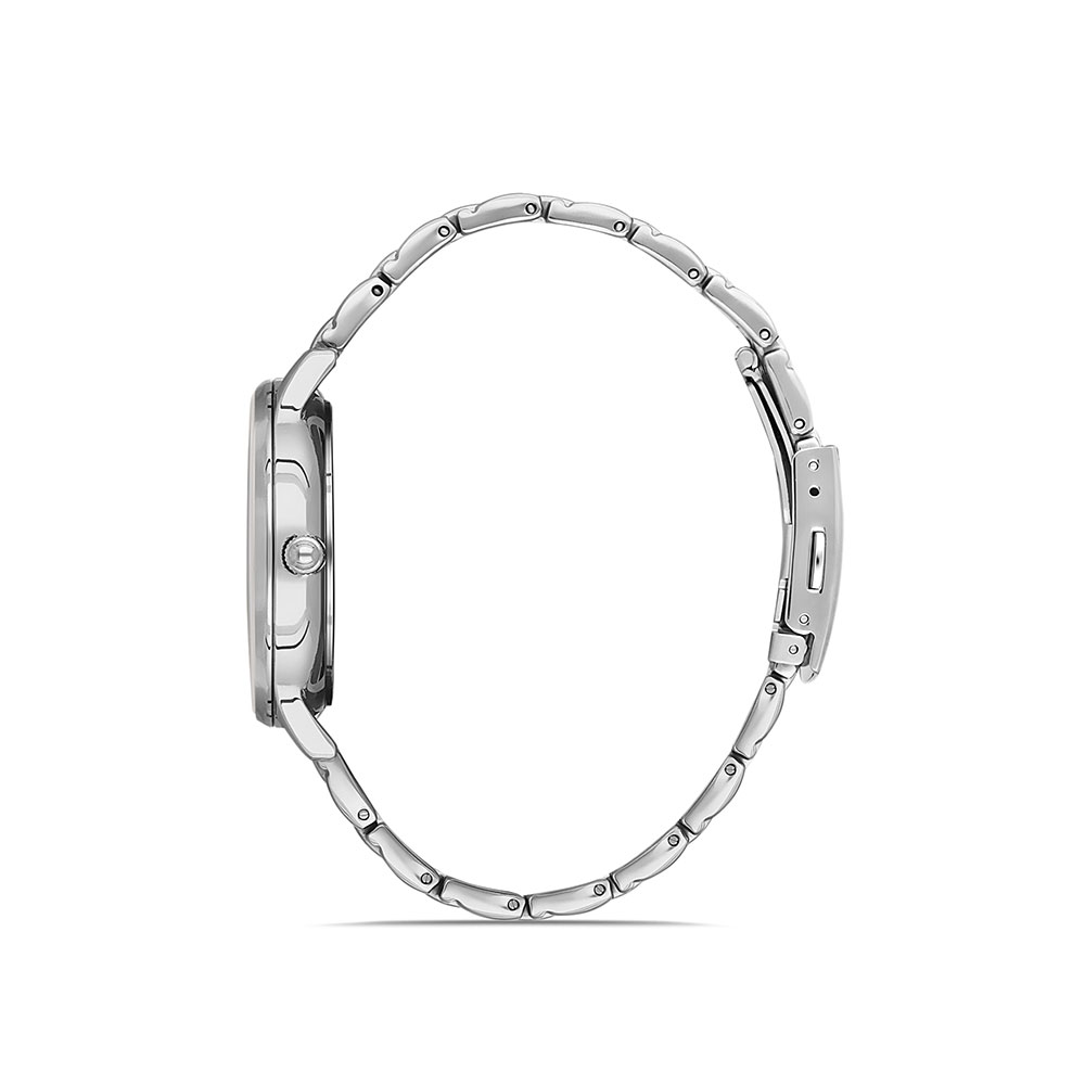 Cadran decorat cu zirconii albe; bratara tip zale, cu inchizatoare tip fluture.