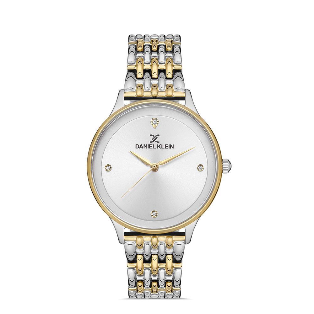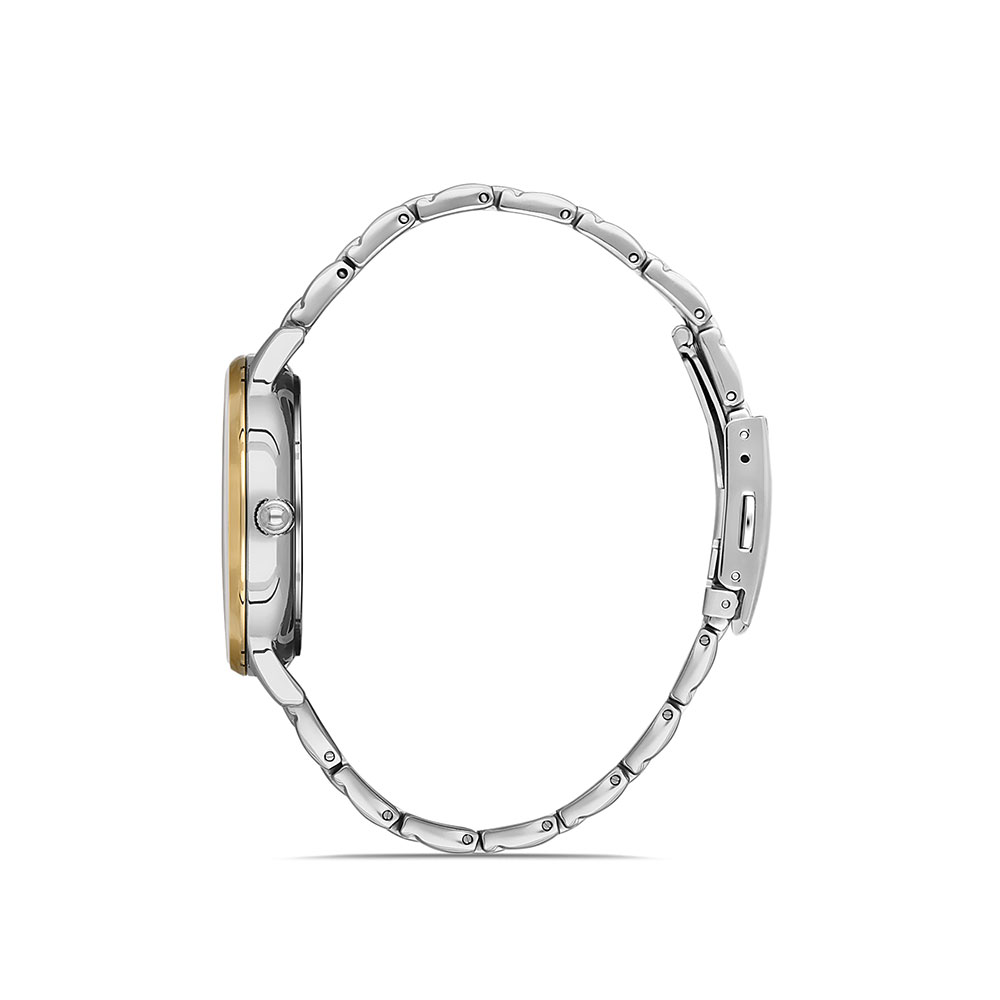 Cadran decorat cu zirconii albe; carcasa argintie, cu bezel decorativ auriu; bratara tip zale, in doua culori, argintiu si auriu, cu inchizatoare tip fluture.