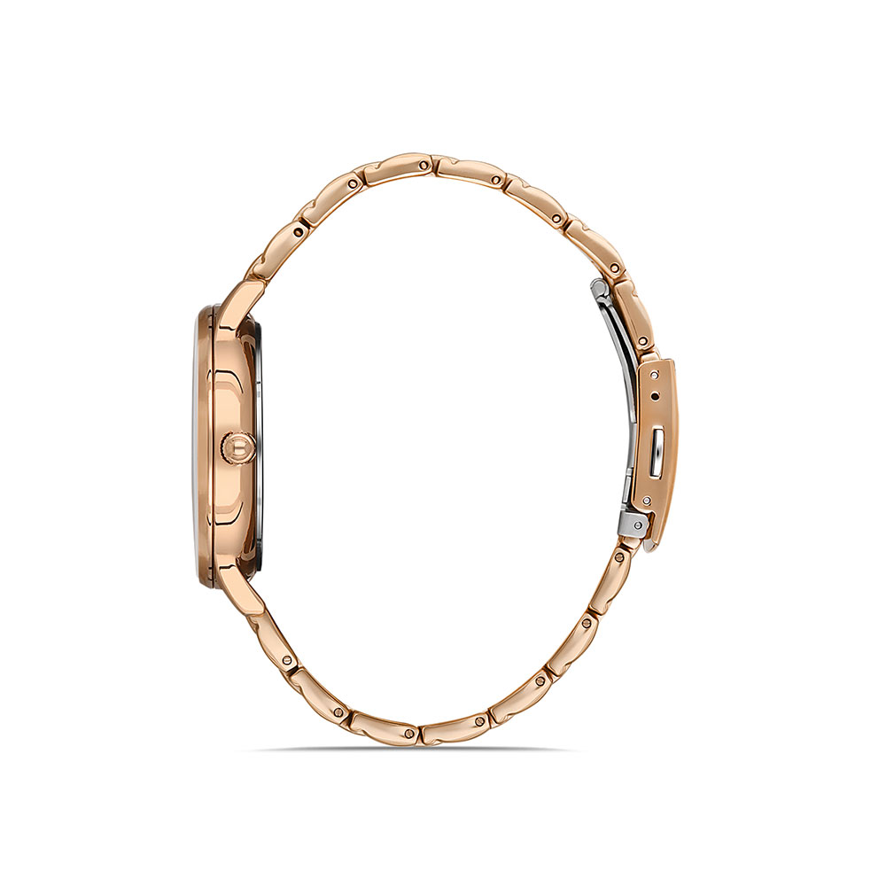 Bratara din otel inoxidabil auriu rose adauga un plus de durabilitate si confort, fiind prevazuta cu un sistem de inchidere fluture pentru o fixare sigura si eleganta pe incheietura. Mecanismul quartz japonez asigura o precizie de exceptie, cu o abatere de doar ±20 secunde pe luna.