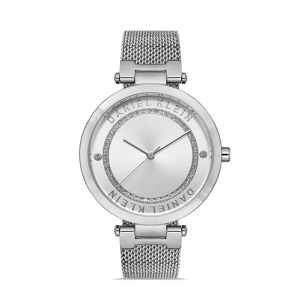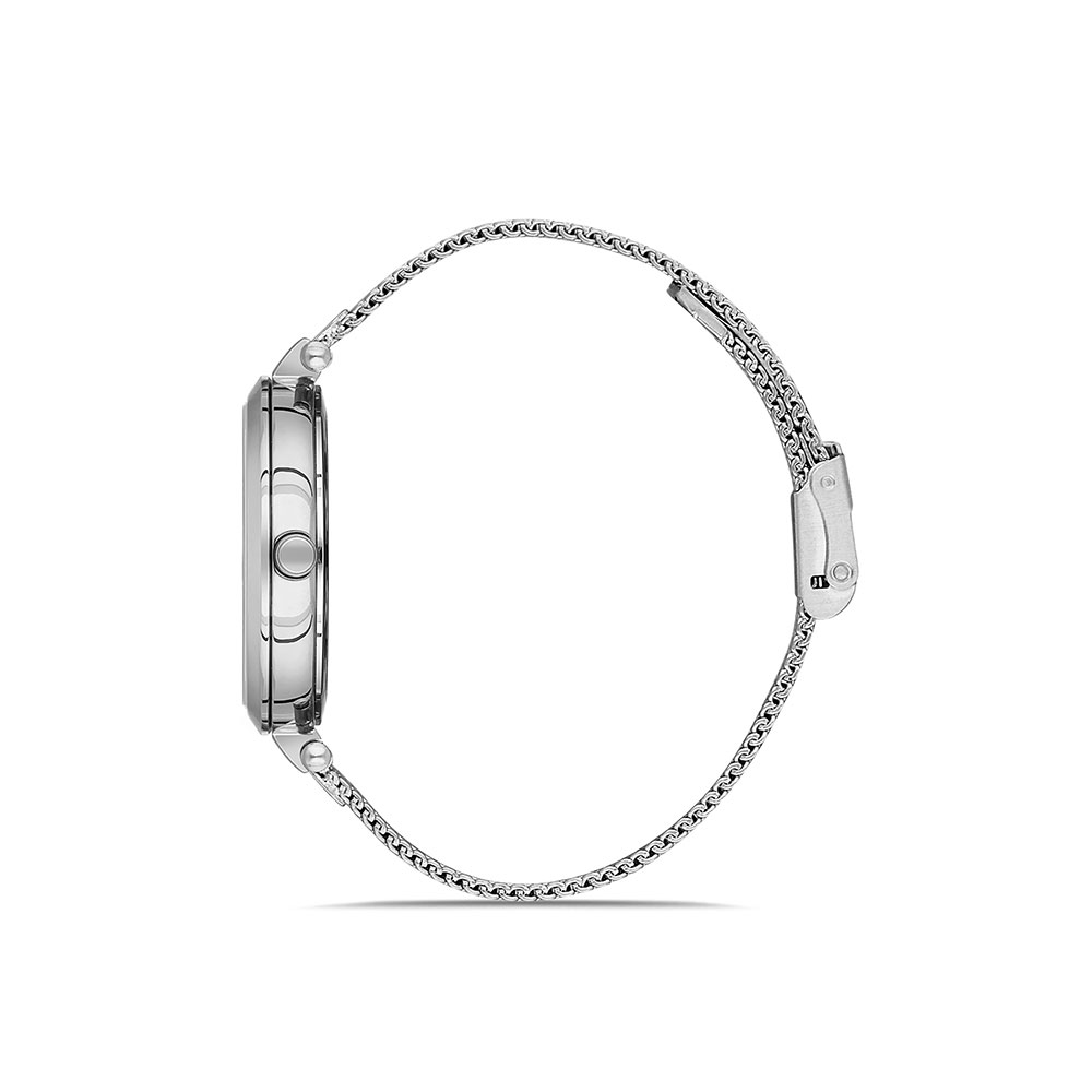 Cadran decorat cu zirconii albe; bratara tip mesh, cu inchizatoare reglabila.