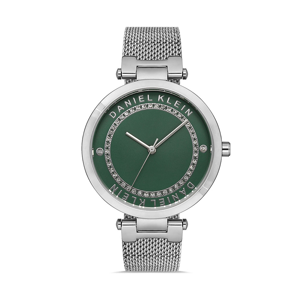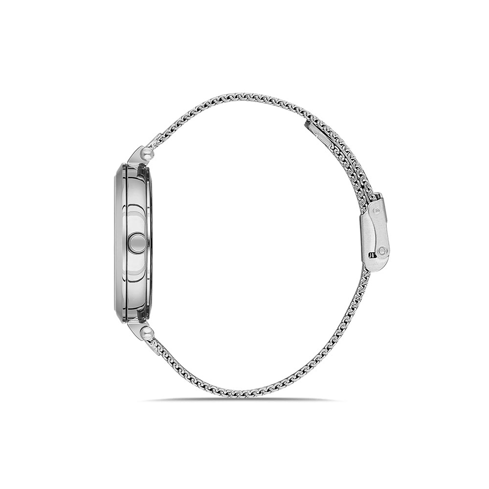 Cadran decorat cu zirconii albe; bratara tip mesh, cu inchizatoare reglabila.
