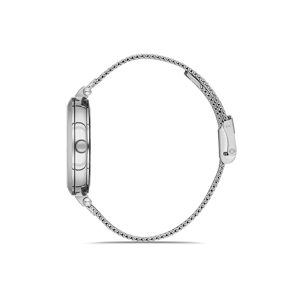 Cadran decorat cu zirconii albe; bratara tip mesh, cu inchizatoare reglabila.