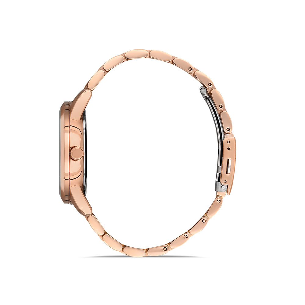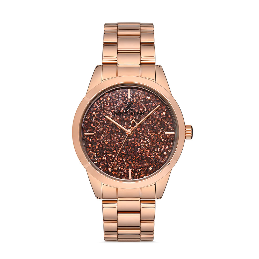 Cadranul aramiu este decorat cu un model spectaculos de cristale stralucitoare, oferindu-i un aspect luxos si unic. Combinatia cu carcasa si bratara din otel inoxidabil auriu rose adauga un plus de eleganta, facandu-l potrivit atat pentru tinutele de zi, cat si pentru evenimente speciale.