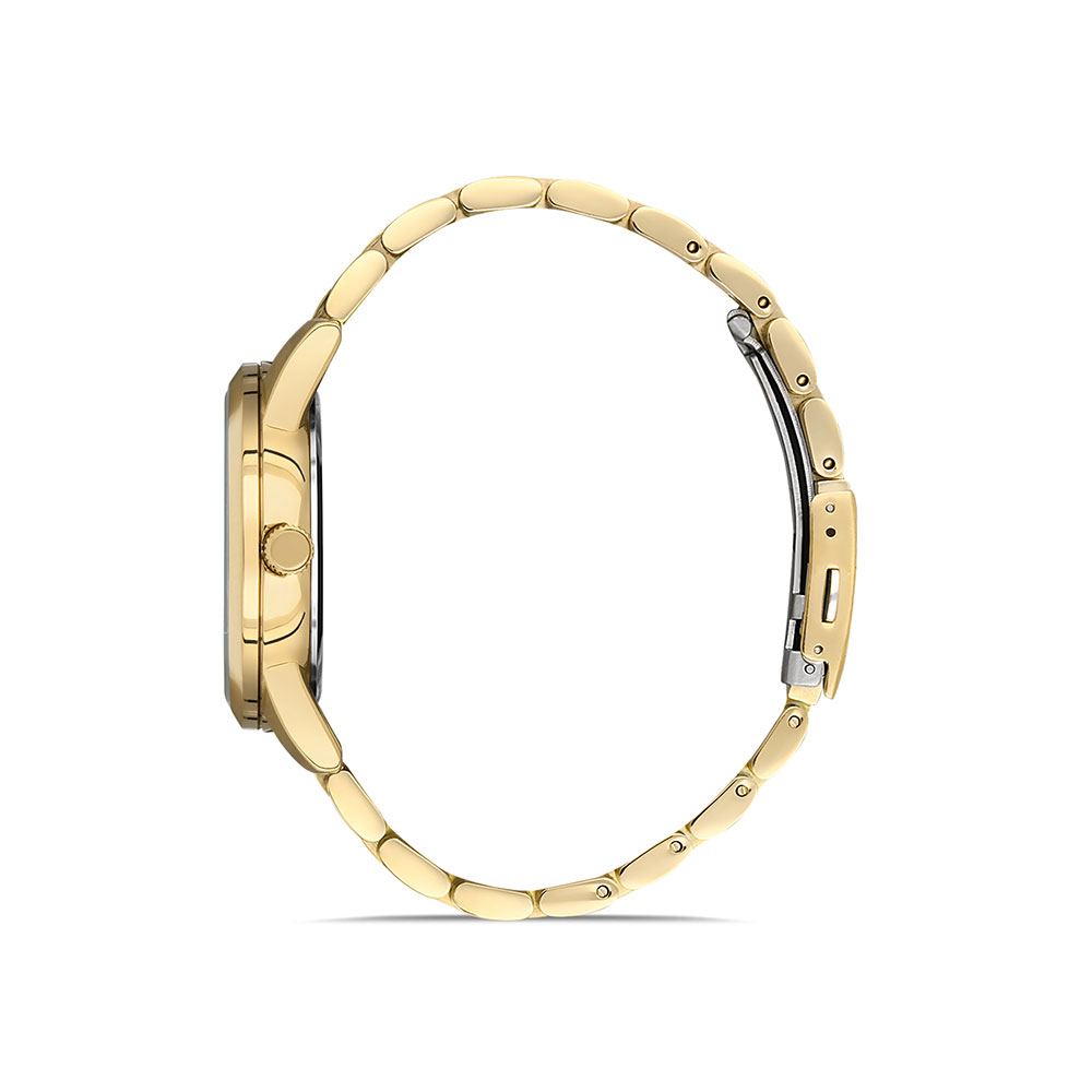 Cu o carcasa rotunda aurie din aliaj metalic si un cadran argintiu decorat cu cristale stralucitoare, acest model ofera un plus de rafinament oricarei tinute. Bratara din otel inoxidabil auriu completeaza perfect aspectul luxos, asigurand in acelasi timp durabilitate si confort la purtare.