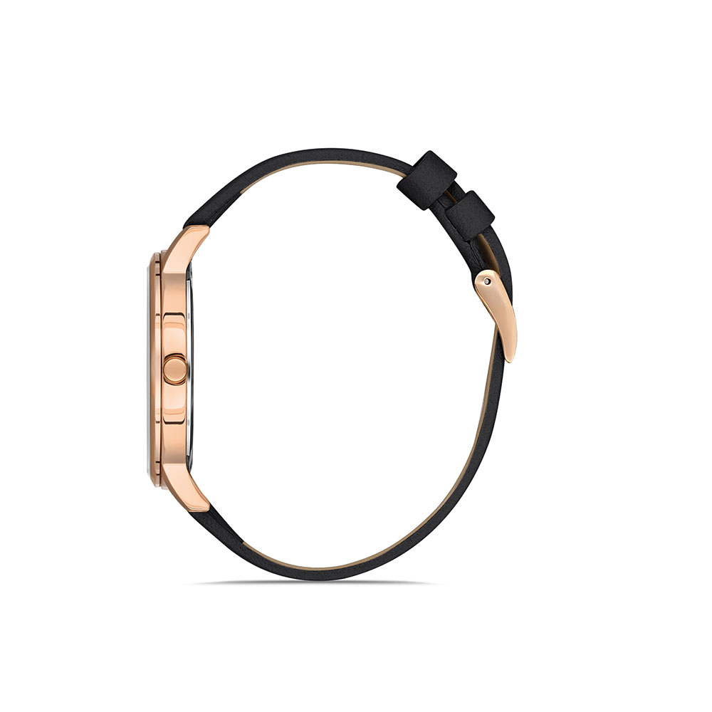 Cureaua din piele neagra, moale si confortabila, se fixeaza cu un sistem de inchidere tip catarama, oferind o potrivire sigura si placuta pe incheietura. Cu o rezistenta la apa de 3 ATM, ceasul este potrivit pentru utilizarea zilnica, protejandu-se impotriva stropilor accidentali.