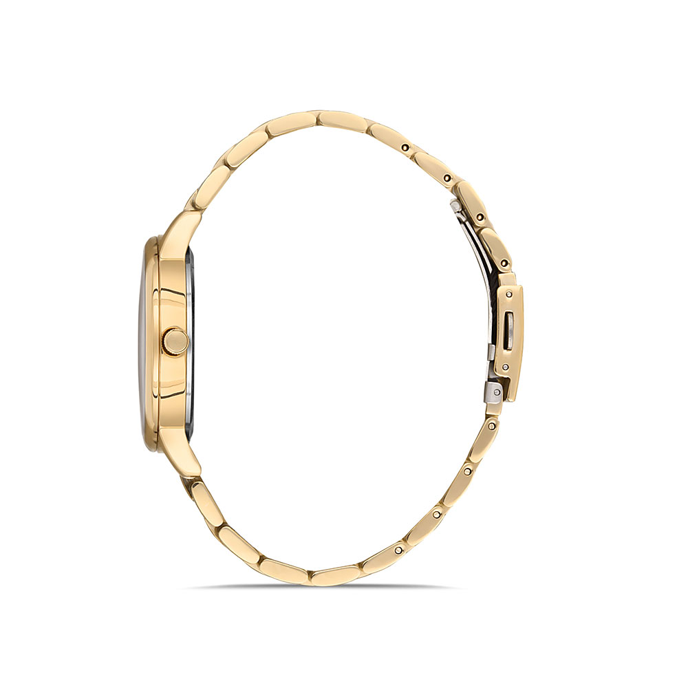Cadran decorat cu zirconii albe; bratara tip zale, cu inchizatoare tip fluture.