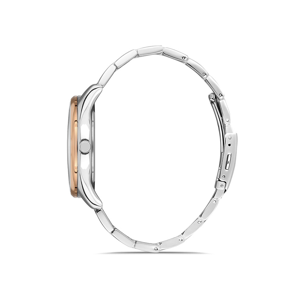 Carcasa argintie, cu bezel decorativ auriu rose; bratara tip zale, in doua culori, argintiu si auriu rose, cu inchizatoare tip fluture; afiseaza data si ziua curente.