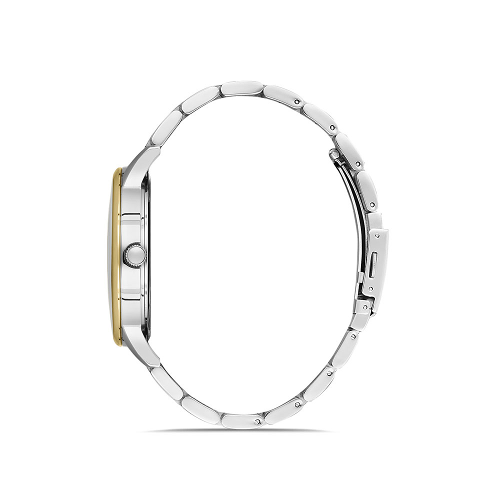 Carcasa argintie, cu bezel decorativ auriu; bratara tip zale, in doua culori, argintiu si auriu, cu inchizatoare tip fluture; afiseaza data curenta.