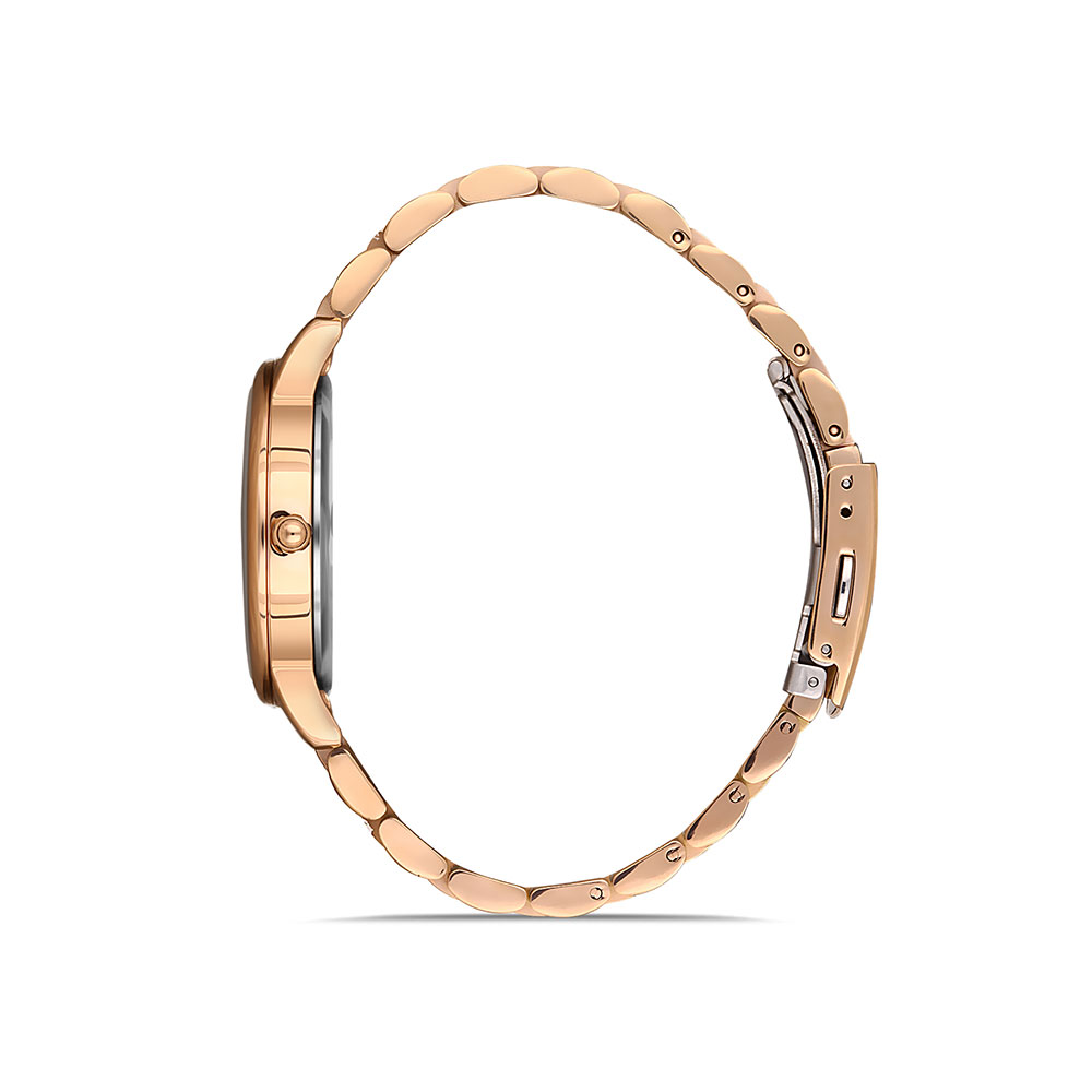 Cadran decorat cu zirconii albe; bratara tip zale, cu inchizatoare tip fluture.