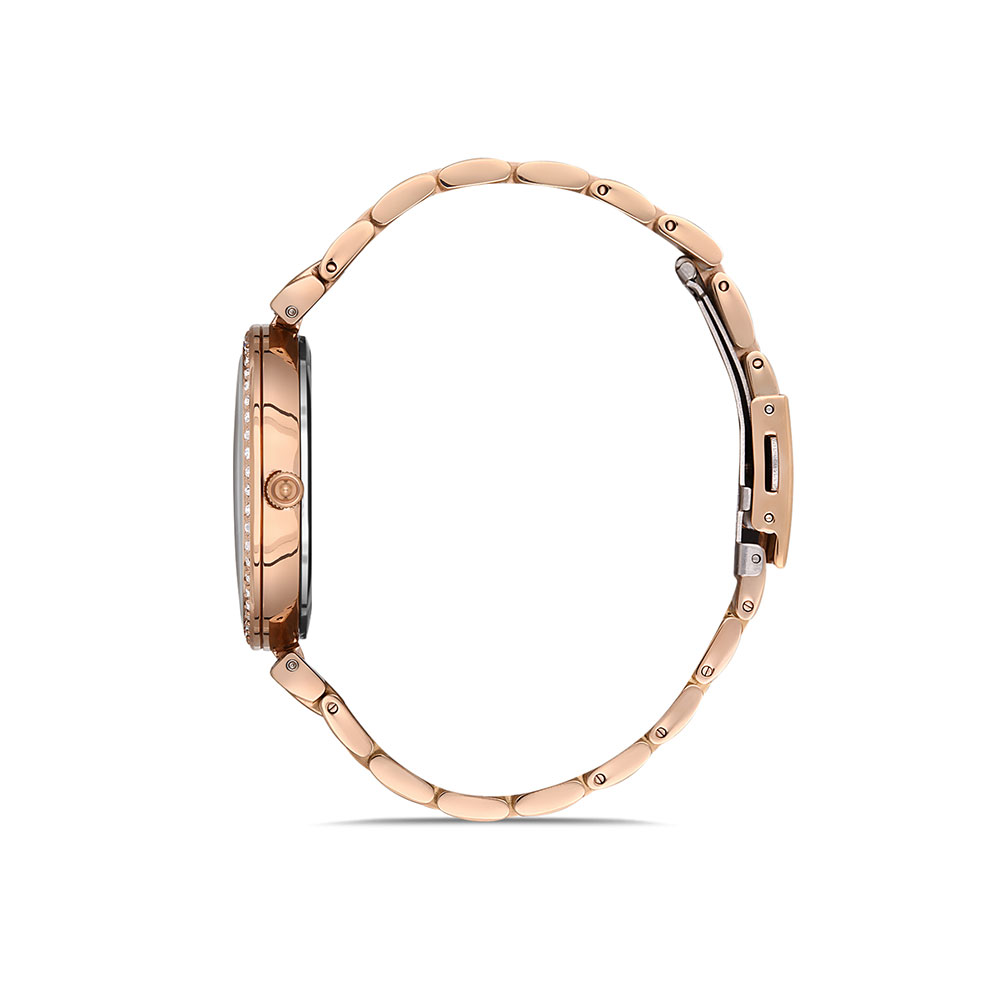 Carcasa decorata cu zirconii albe; bratara tip zale, cu inchizatoare tip fluture, decorata cu zirconii albe.
