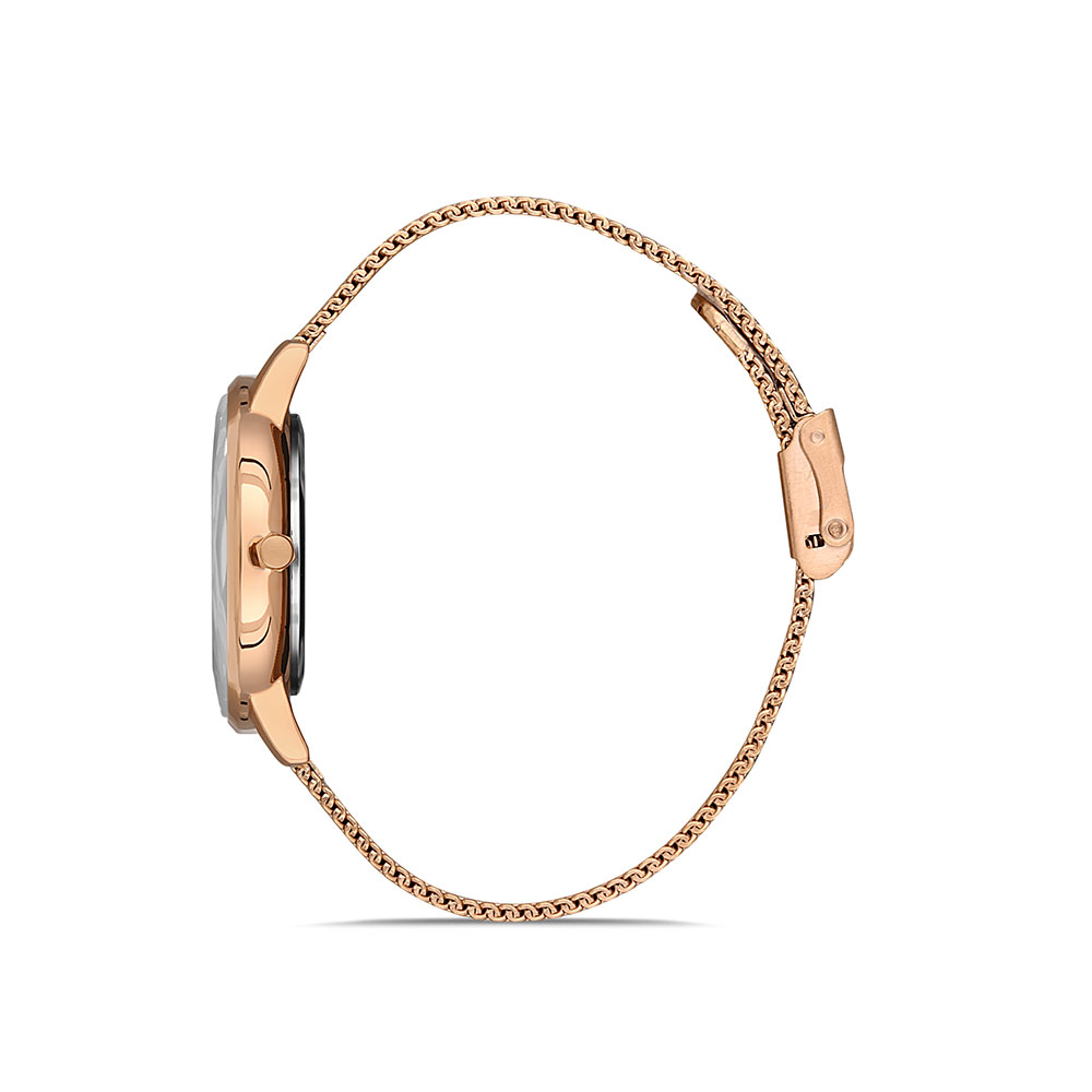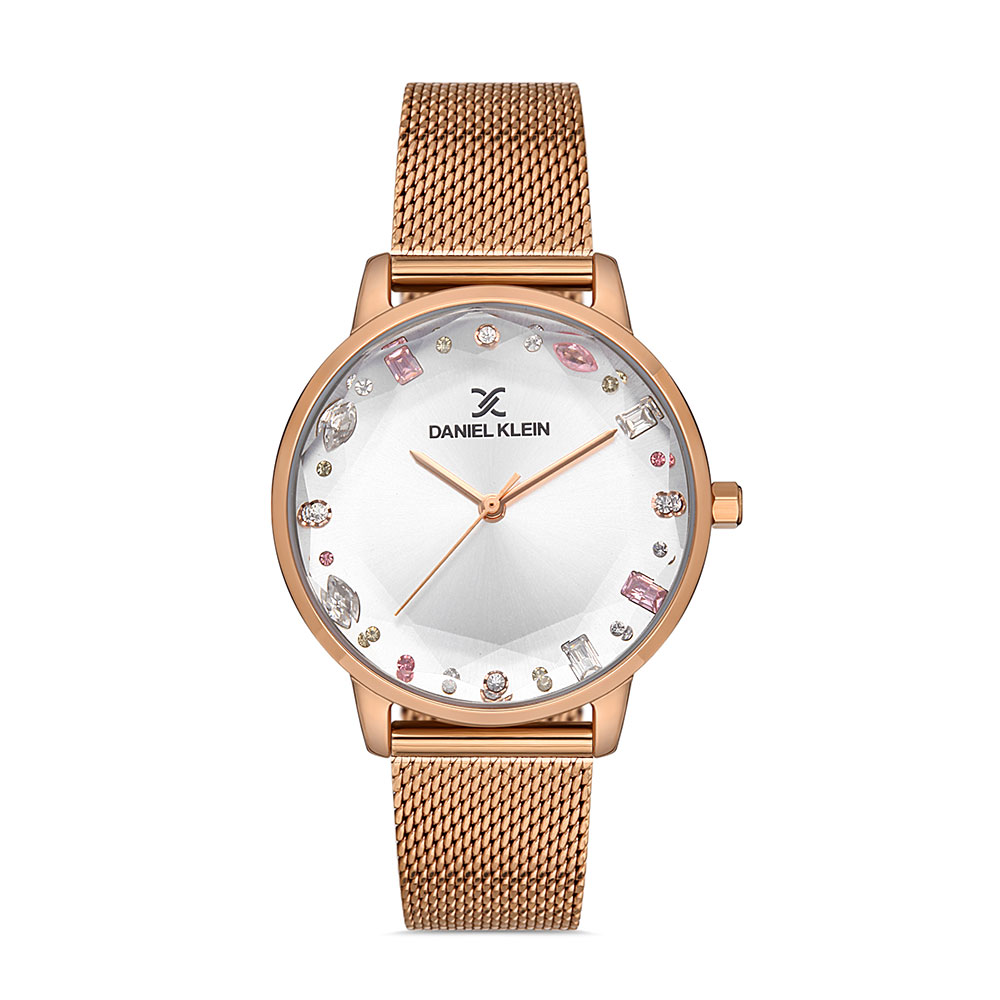 Cadran decorat cu zirconii multicolore; geam fatetat; bratara tip mesh, cu inchizatoare reglabila.