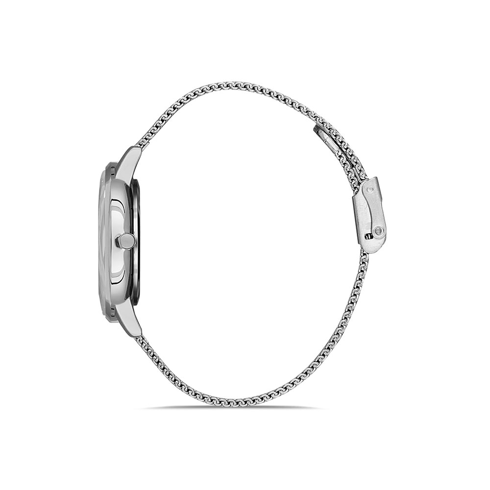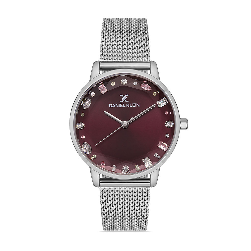 Cadran decorat cu zirconii multicolore; geam fatetat; bratara tip mesh, cu inchizatoare reglabila.