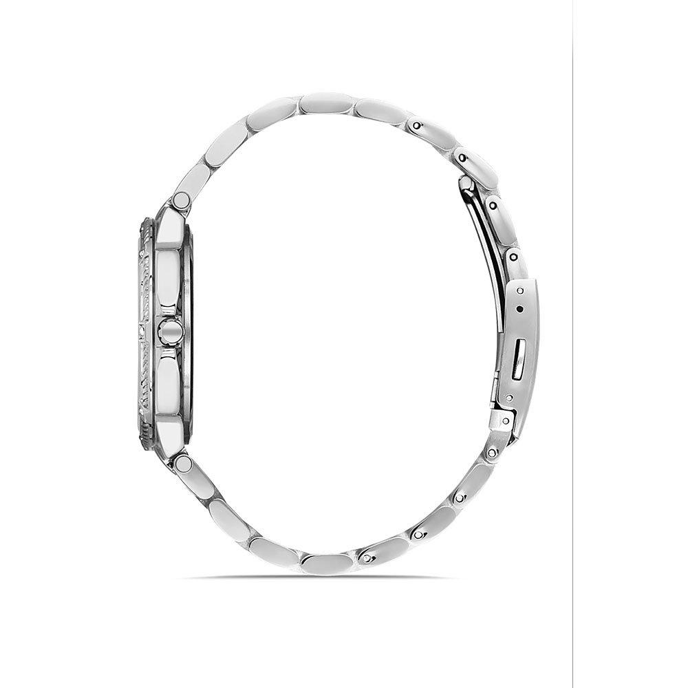 Indicatoare luminoase; carcasa cu bezel decorativ in forma impletita si zirconii albe; bratara tip zale, cu inchizatoare tip fluture.