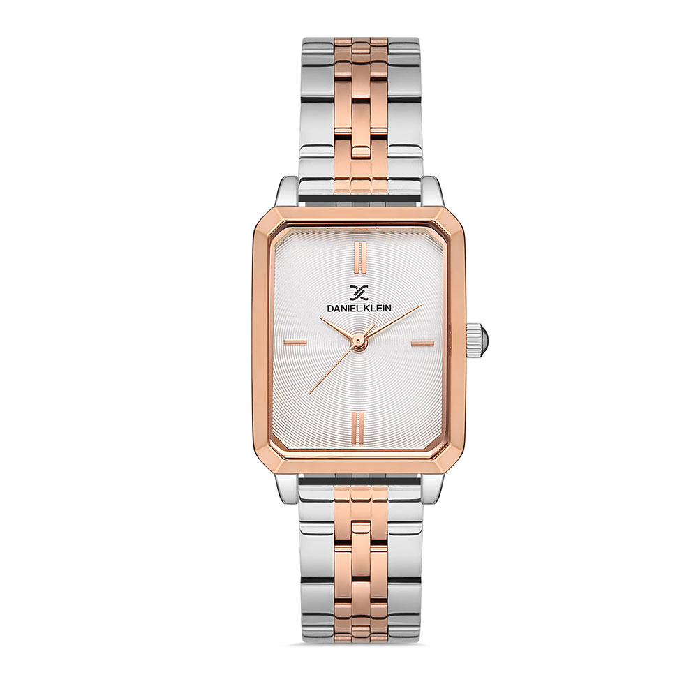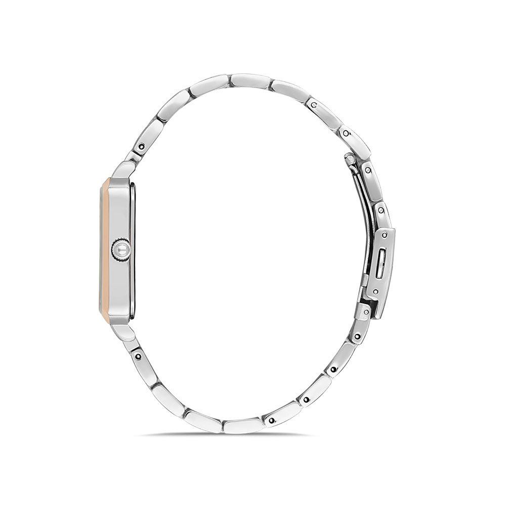 Cadranul argintiu cu finisaj texturat adauga un plus de distinctie, fiind protejat de un geam din cristal mineral rezistent la zgarieturi. Carcasa dreptunghiulara din aliaj metalic, cu o nuanta sofisticata de auriu rose, completeaza armonios designul acestui ceas.