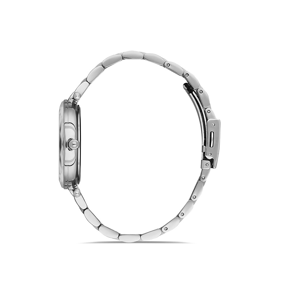 Cadran decorat cu zirconii albe; geam fatetat; carcasa decorata cu zirconii albe; bratara tip zale, cu inchizatoare tip fluture.