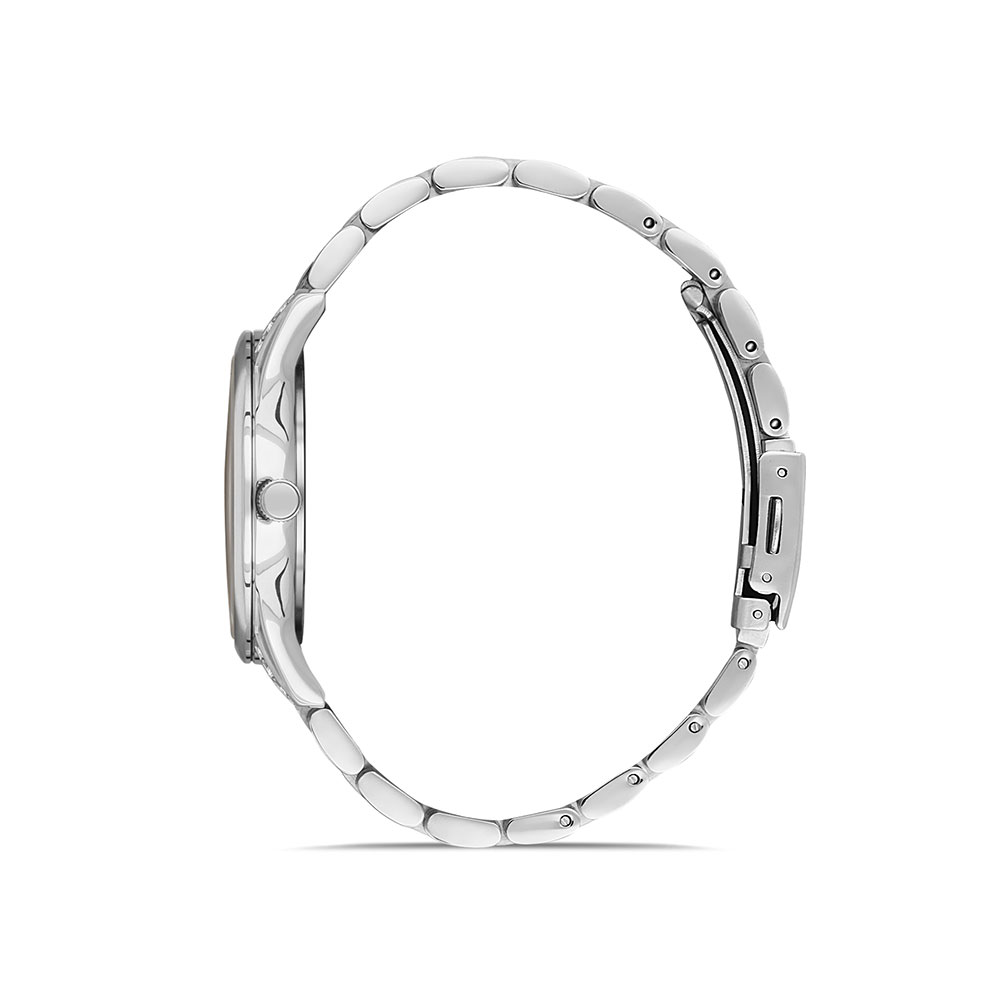 Cadran alb sidefat, decorat cu zirconii albe; indicatoare luminoase; bratara tip zale, cu inchizatoare tip fluture.