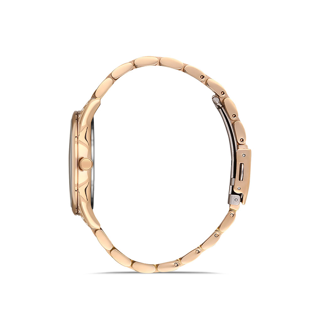 Cadran alb sidefat, decorat cu zirconii albe; indicatoare luminoase; bratara tip zale, cu inchizatoare tip fluture.