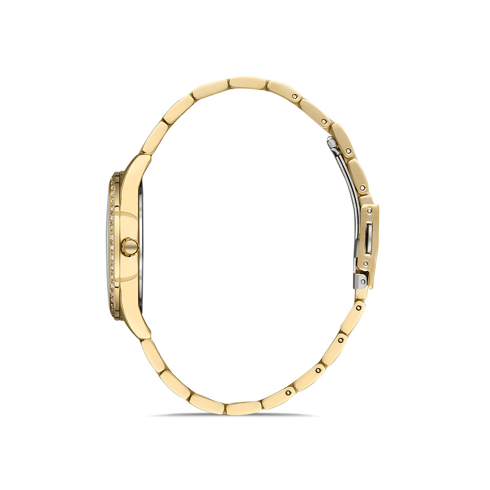 Carcasa decorata cu zirconii albe; bratara tip zale, cu inchizatoare tip fluture.