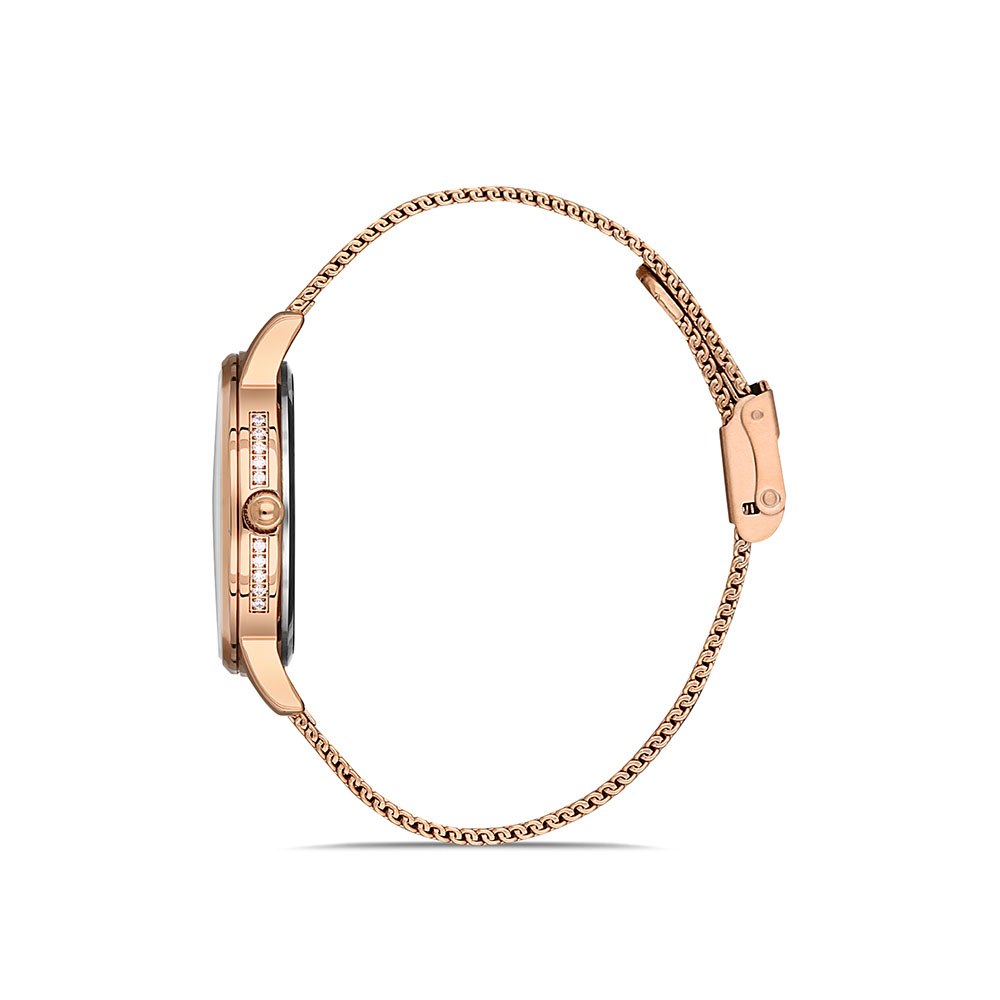 Cadran si carcasa decorate cu zirconii albe; bratara tip mesh, cu inchizatoare reglabila.