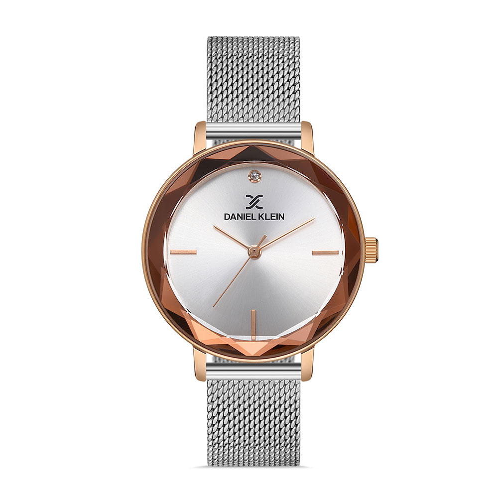 Carcasa rotunda din aliaj metalic, cu un diametru de 34 mm si finisaj auriu rose, adauga un plus de eleganta, in timp ce cadranul argintiu ofera un contrast subtil si sofisticat. Decorat cu un cristal delicat la ora 12, acest ceas capteaza lumina intr-un mod spectaculos, evidentiind rafinamentul sau.
