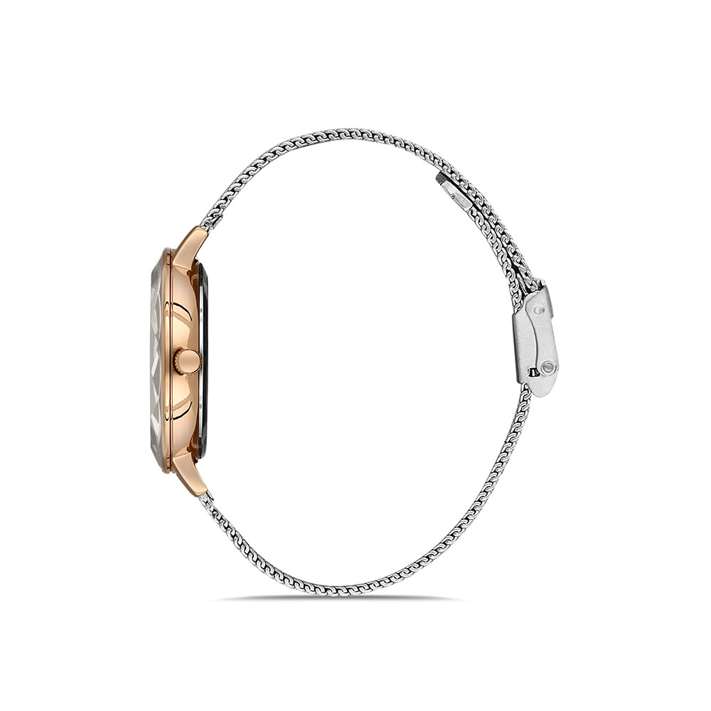 Bratara metalica argintie de tip mesh confera un aspect modern si confort sporit, asigurand o potrivire perfecta datorita sistemului de inchidere reglabil. Mecanismul quartz japonez garanteaza precizia, avand o abatere de doar ±20 secunde pe luna.