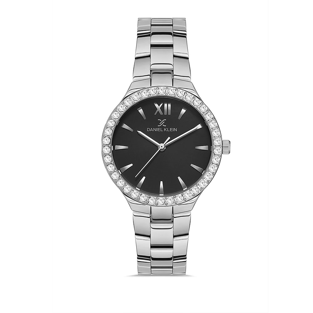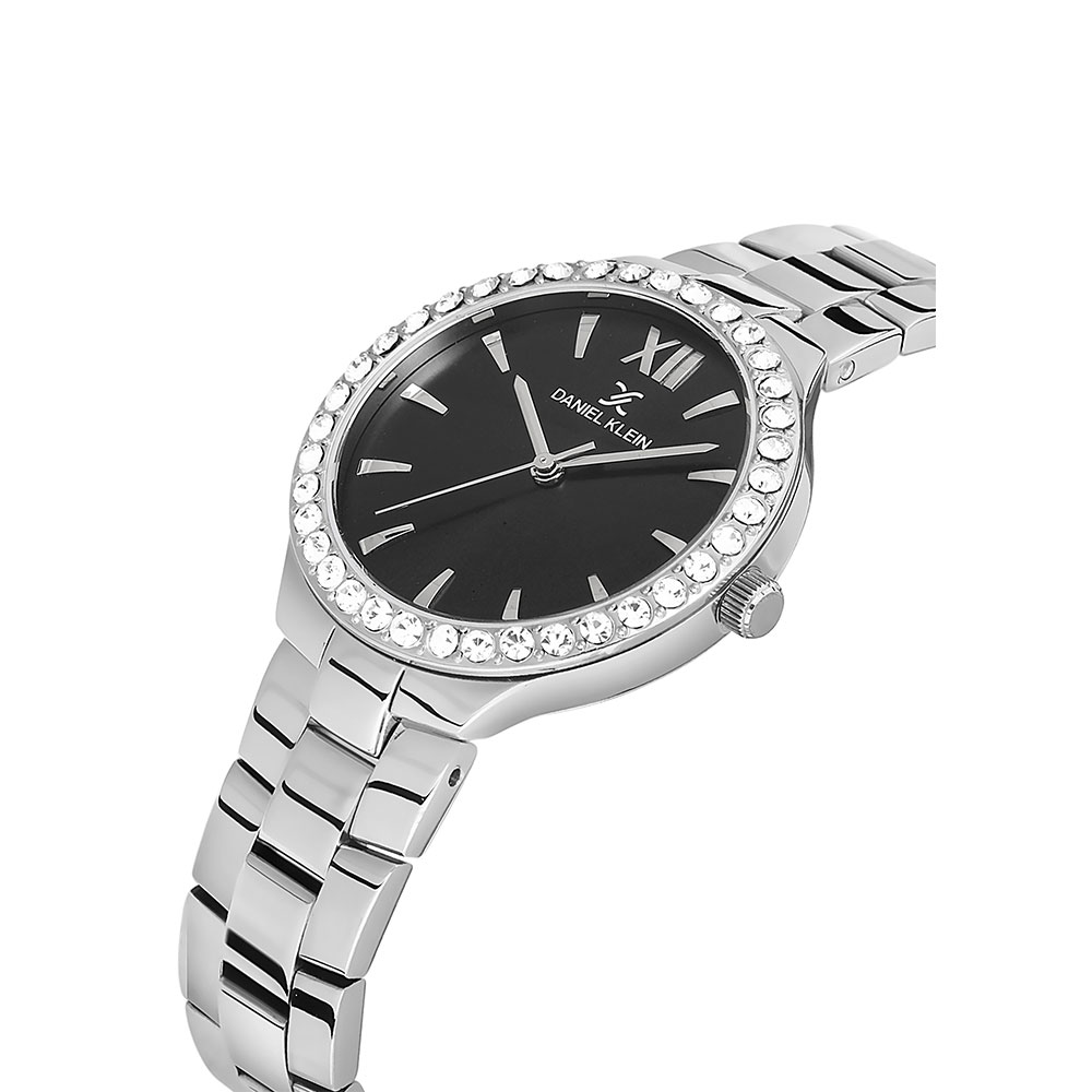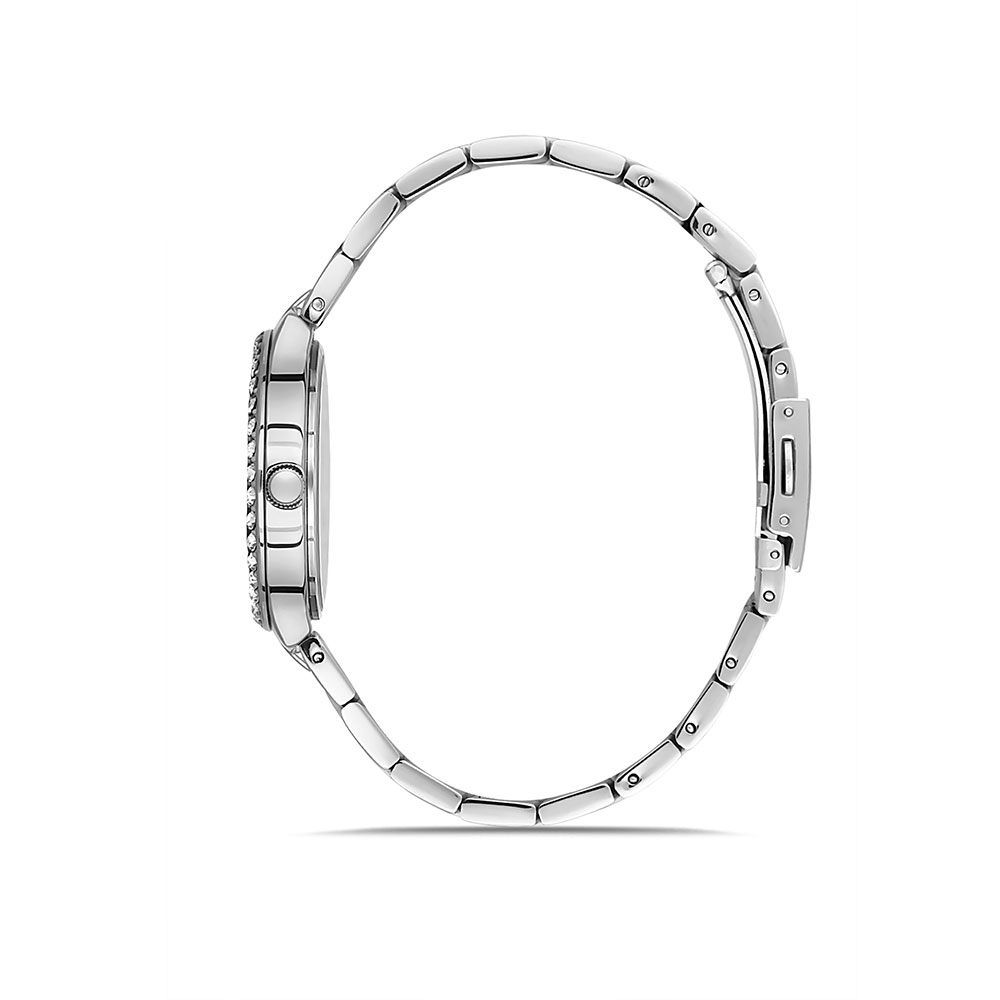 Carcasa decorata cu zirconii albe; bratara tip zale, cu inchizatoare tip fluture.