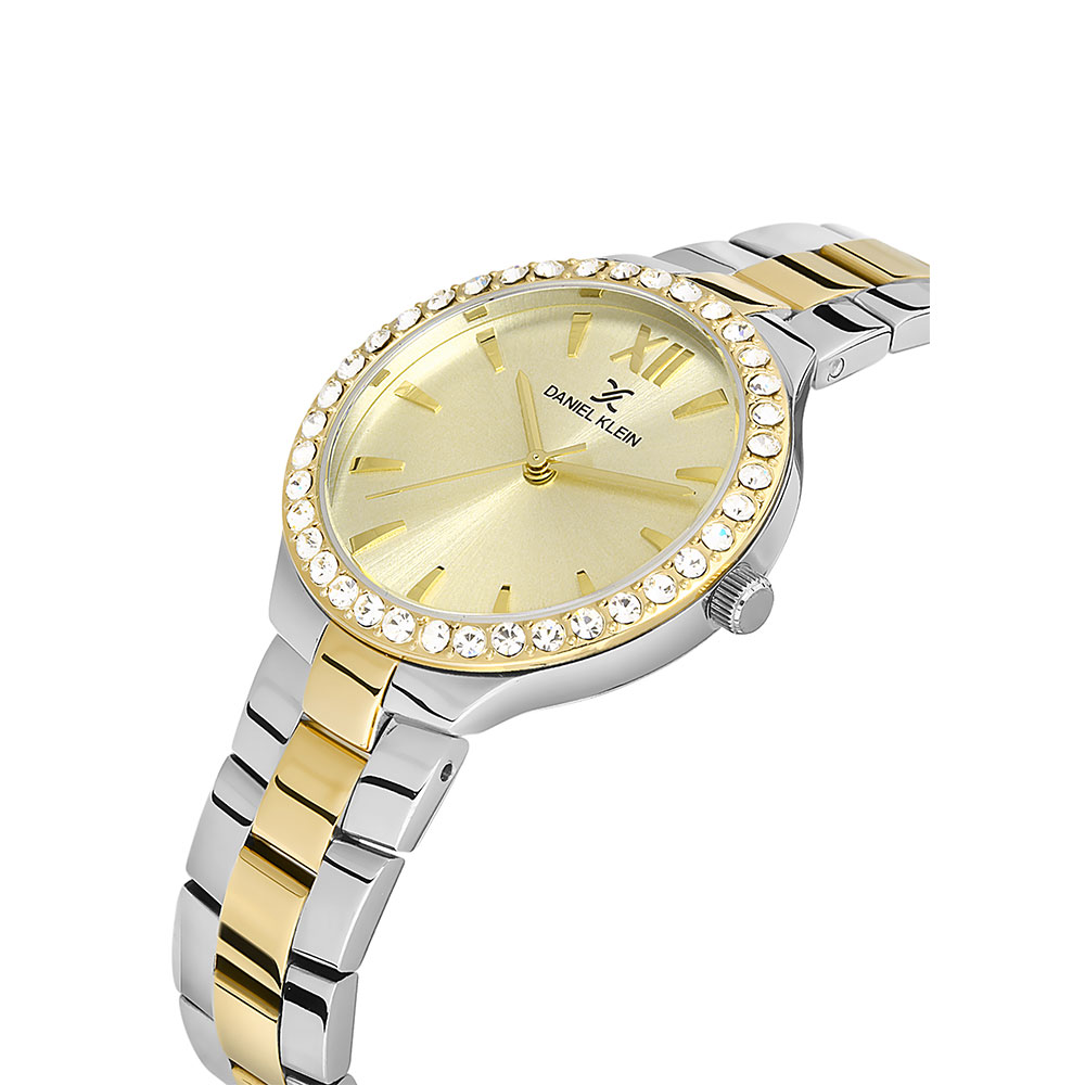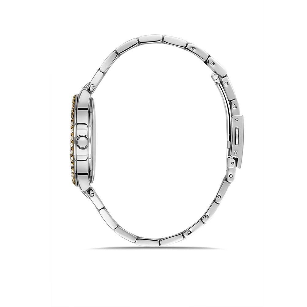 Carcasa cu bezel decorativ auriu si zirconii albe; bratara tip zale, in doua culori, argintiu si auriu, cu inchizatoare tip fluture.