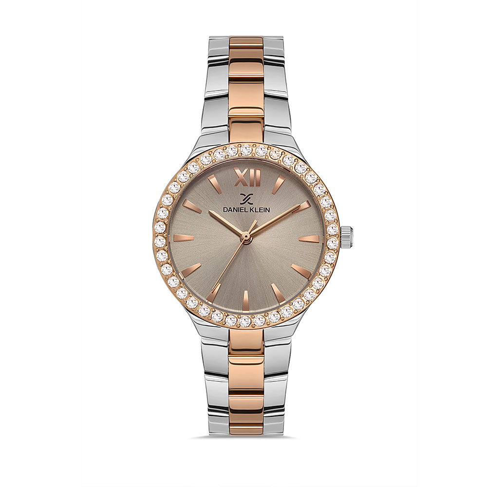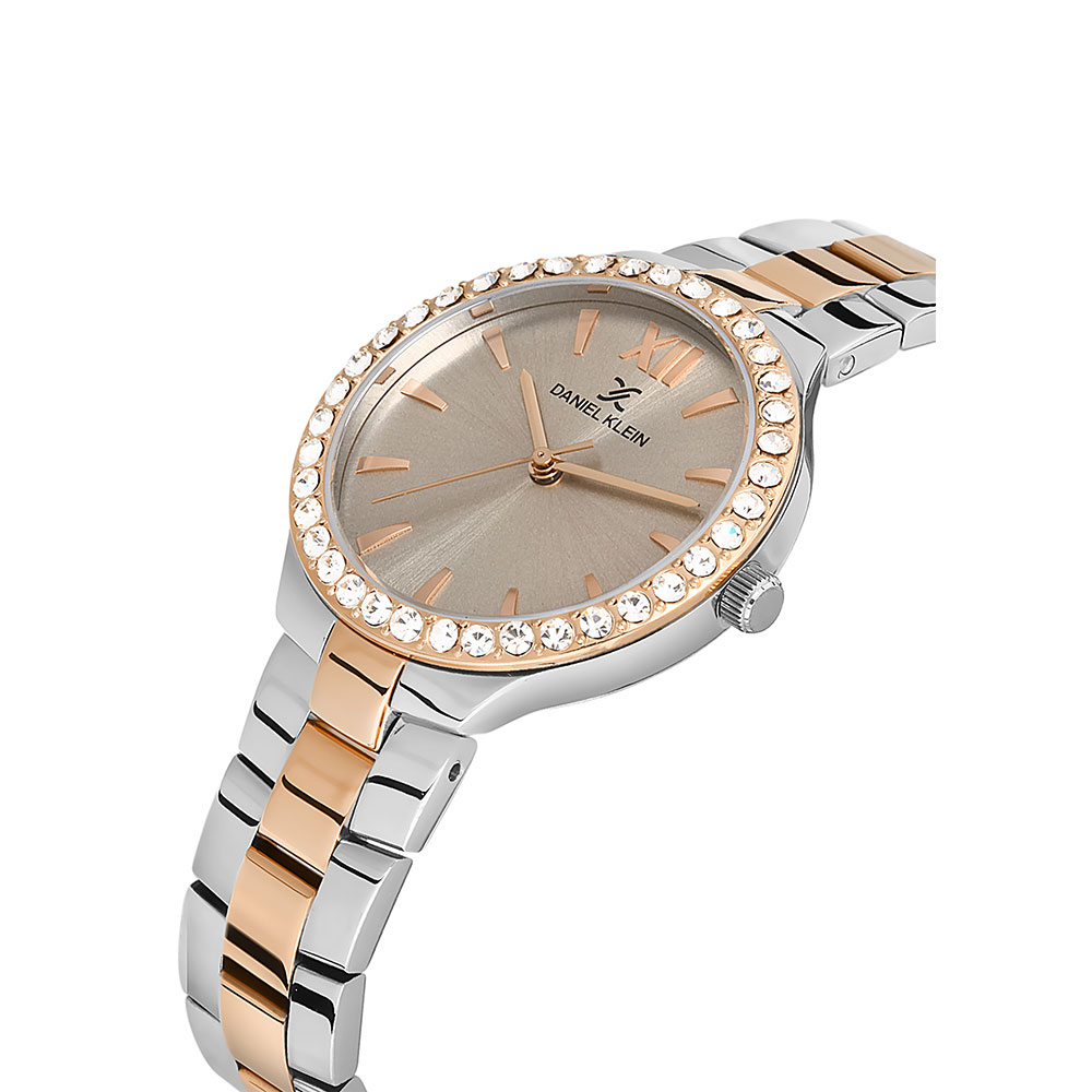 Carcasa cu bezel decorativ auriu rose si zirconii albe; bratara tip zale, in doua culori, argintiu si auriu rose, cu inchizatoare tip fluture.