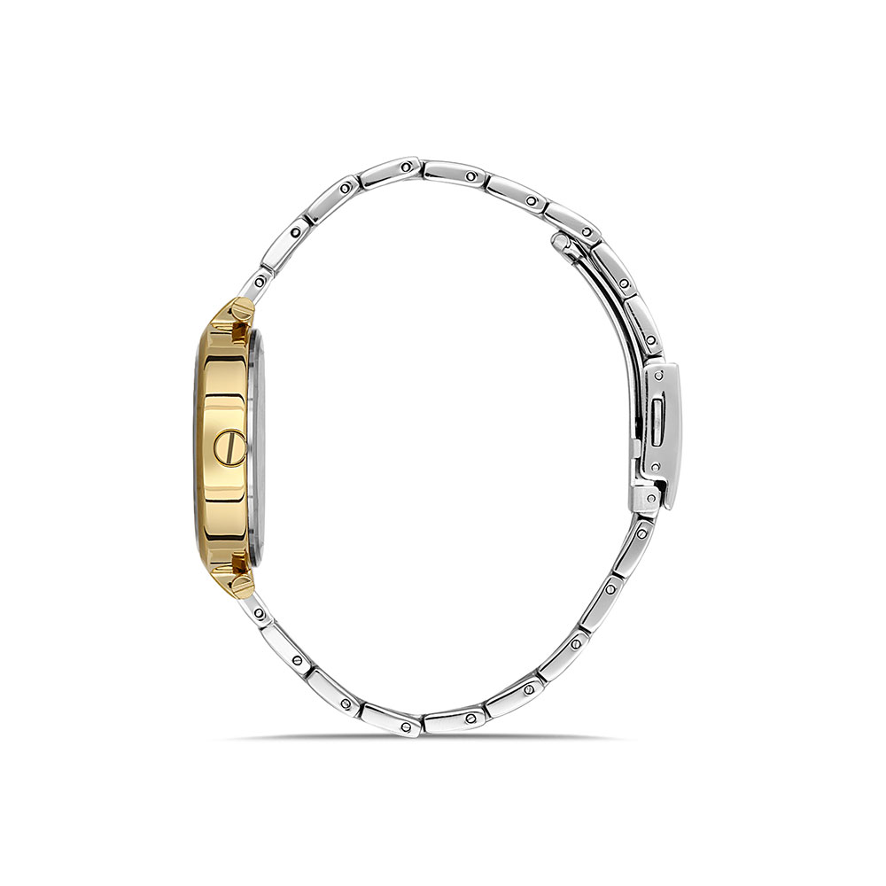 Cadran decorat cu zirconii albe; geam cu suprafata bombata; bratara tip zale, decorata cu zirconii albe, in doua culori, argintiu si auriu, cu inchizatoare tip fluture.