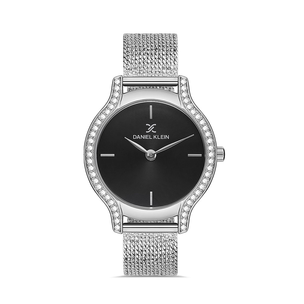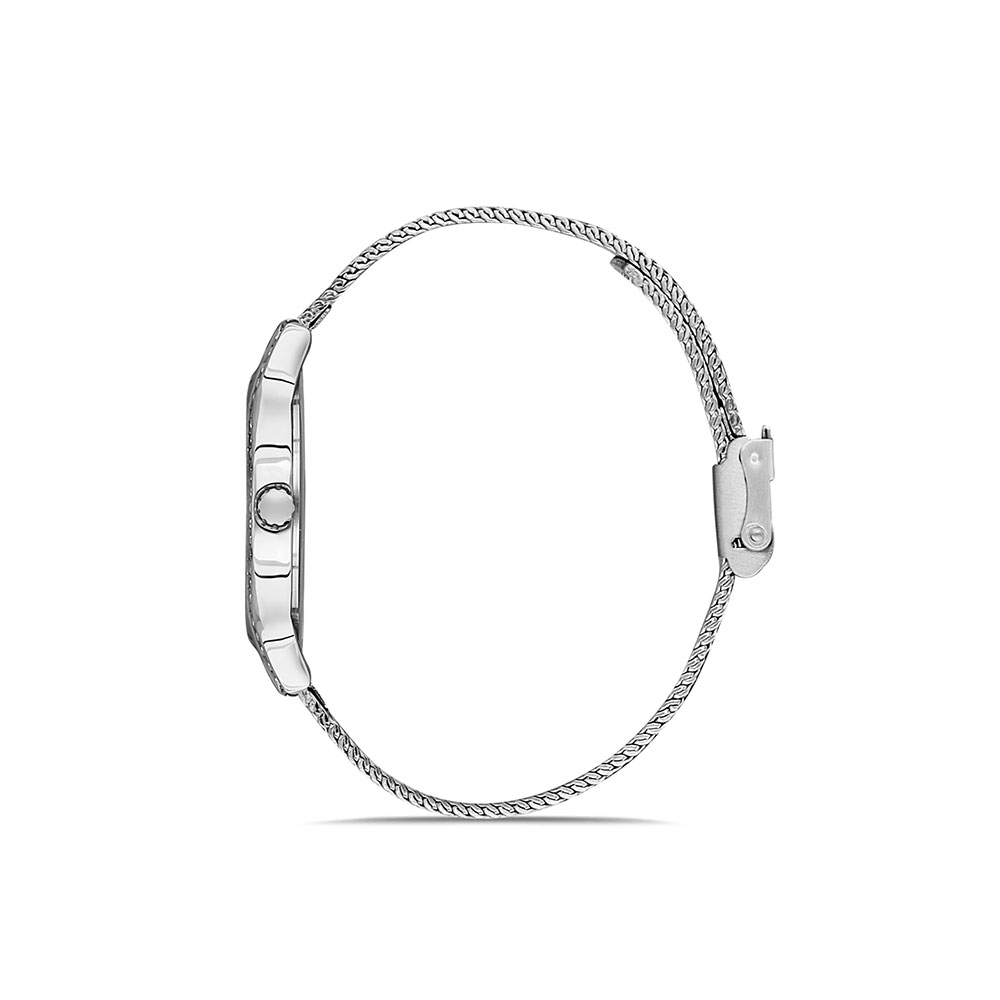 Carcasa decorata cu zirconii albe; bratara tip mesh, cu inchizatoare reglabila; fara indicator secunde.