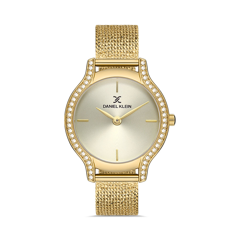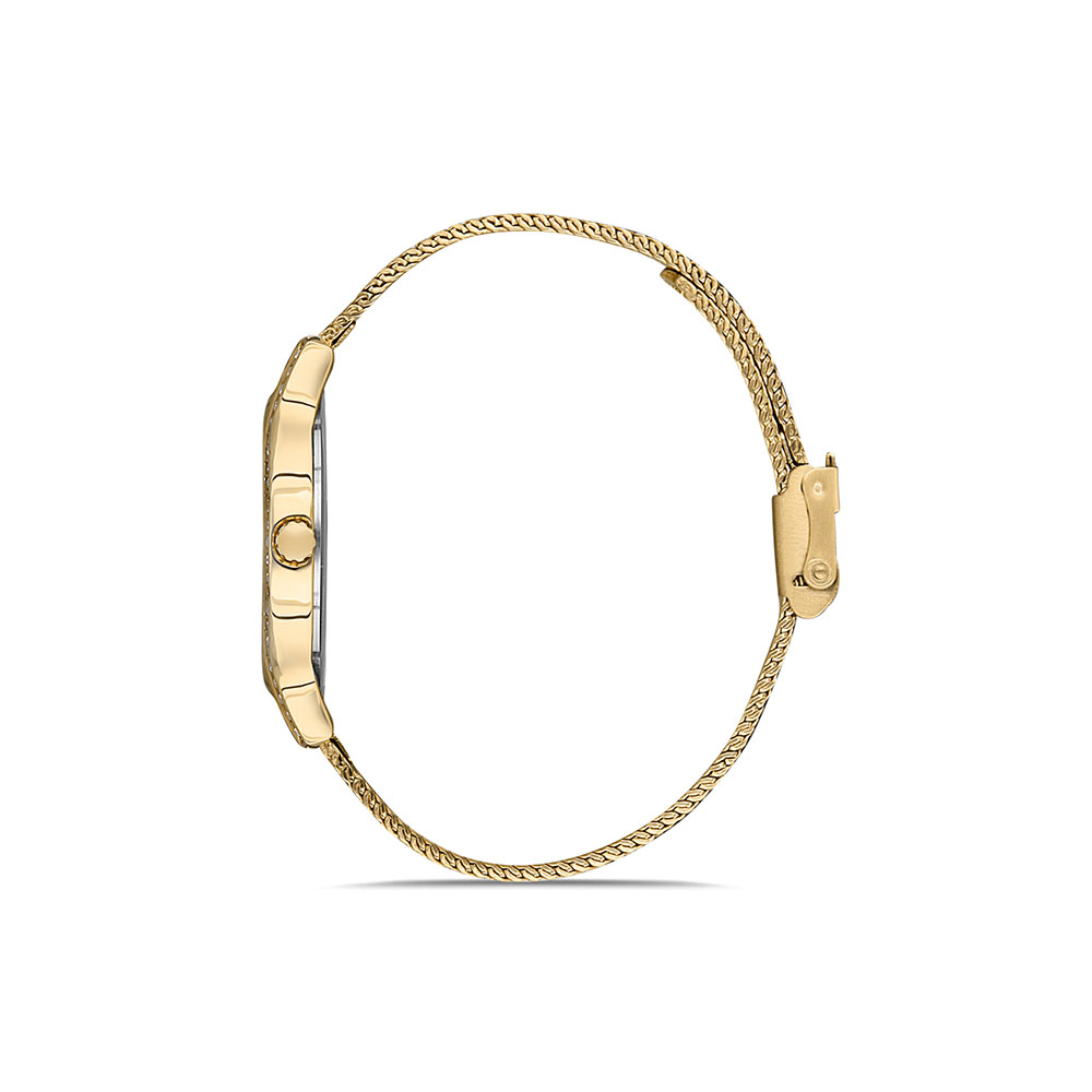 Carcasa decorata cu zirconii albe; bratara tip mesh, cu inchizatoare reglabila; fara indicator secunde.